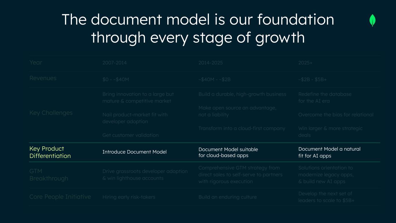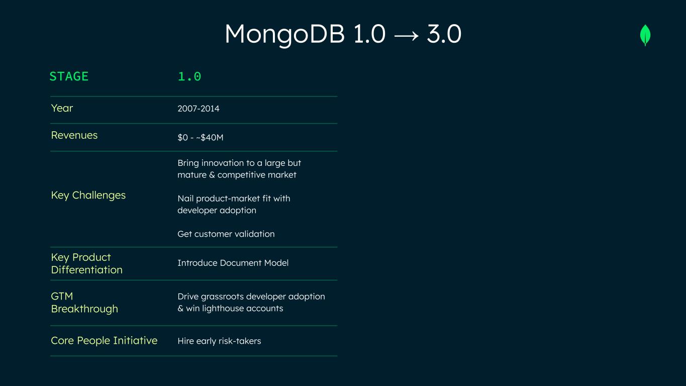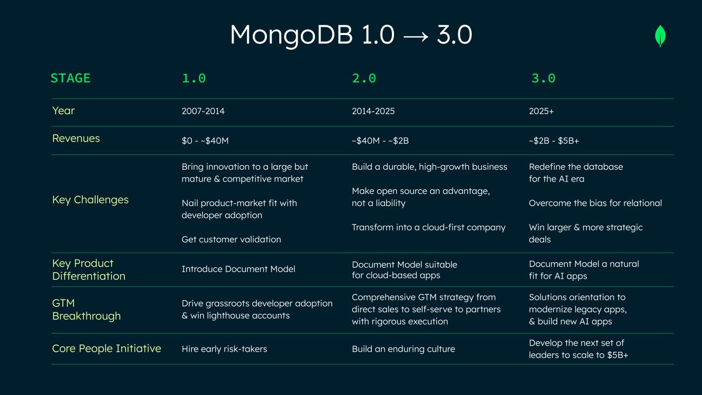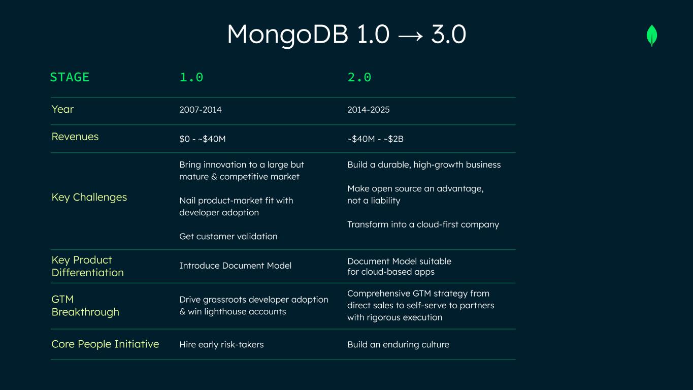 STAGE Year Revenues Key Challenges Key Product Differentiation GTM Breakthrough Core People Initiative MongoDB 1.0 → 3.0 1.0 2.0 3.0 2007-2014 $0 - ~$40M Bring innovation to a large but mature & competitive market Nail product-market fit with developer adoption Get customer validation Introduce Document Model Drive grassroots developer adoption & win lighthouse accounts Hire early risk-takers 2014-2025 ~$40M - ~$2B Build a durable, high-growth business Make open source an advantage, not a liability Transform into a cloud-first company Document Model suitable for cloud-based apps Comprehensive GTM strategy from direct sales to self-serve to partners with rigorous execution Build an enduring culture 2025+ ~$2B - $5B+ Redefine the database for the AI era Overcome the bias for relational Win larger & more strategic deals Document Model a natural fit for AI apps Solutions orientation to modernize legacy apps, & build new AI apps Develop the next set of leaders to scale to $5B+