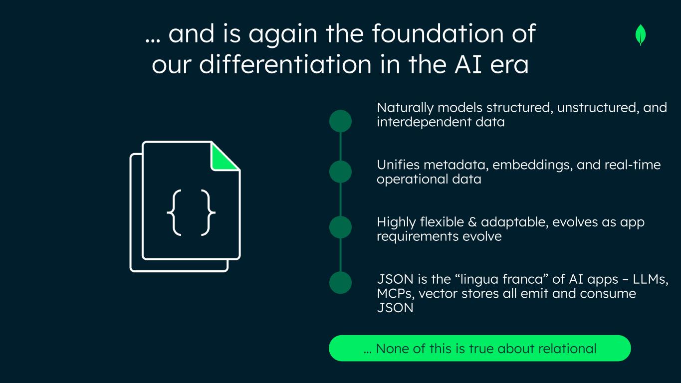 … and is again the foundation of our differentiation in the AI era Naturally models structured, unstructured, and interdependent data Unifies metadata, embeddings, and real-time operational data Highly flexible & adaptable, evolves as app requirements evolve JSON is the “lingua franca” of AI apps – LLMs, MCPs, vector stores all emit and consume JSON … None of this is true about relational