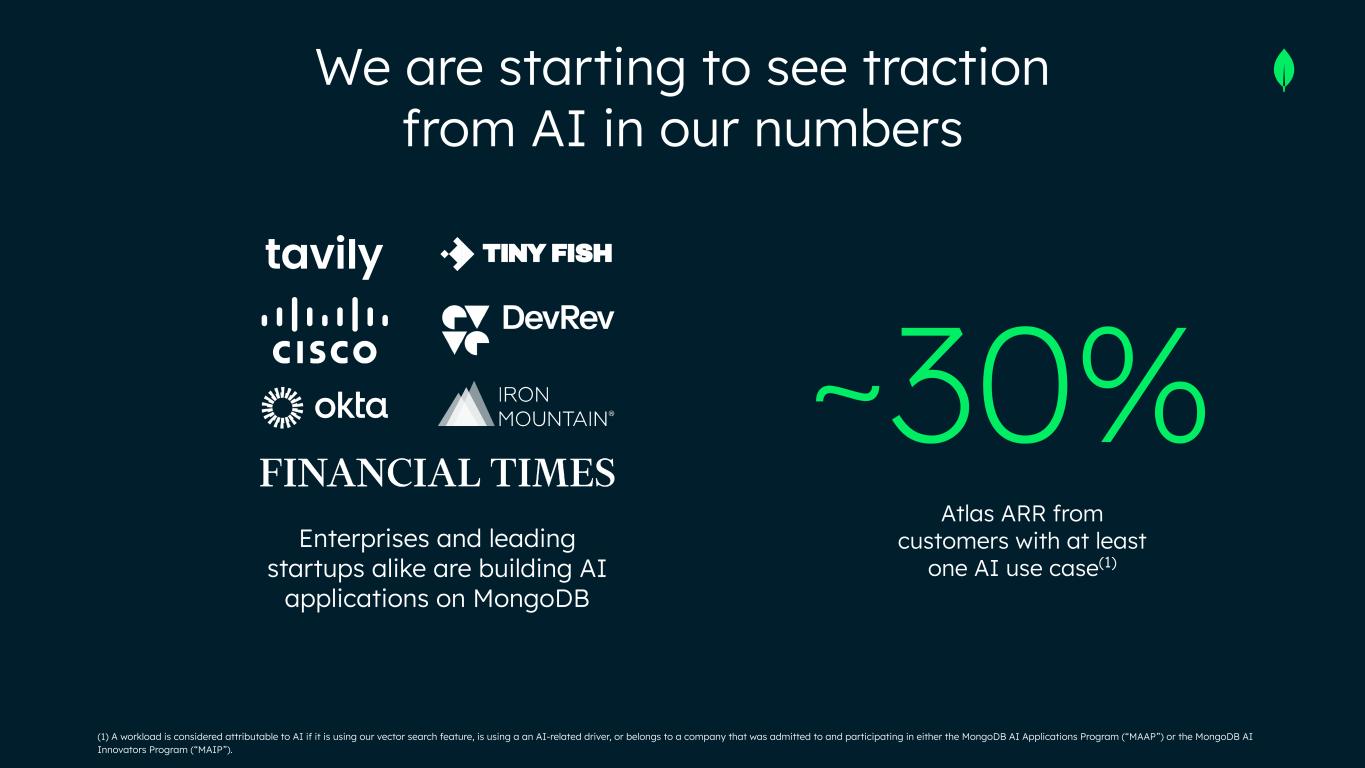 We are starting to see traction from AI in our numbers (1) A workload is considered attributable to AI if it is using our vector search feature, is using a an AI-related driver, or belongs to a company that was admitted to and participating in either the MongoDB AI Applications Program (“MAAP”) or the MongoDB AI Innovators Program (“MAIP”). ~30% Enterprises and leading startups alike are building AI applications on MongoDB Atlas ARR from customers with at least one AI use case(1)