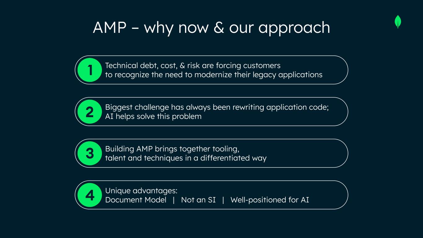 AMP – why now & our approach Technical debt, cost, & risk are forcing customers to recognize the need to modernize their legacy applications Biggest challenge has always been rewriting application code; AI helps solve this problem Building AMP brings together tooling, talent and techniques in a differentiated way Unique advantages: Document Model | Not an SI | Well-positioned for AI