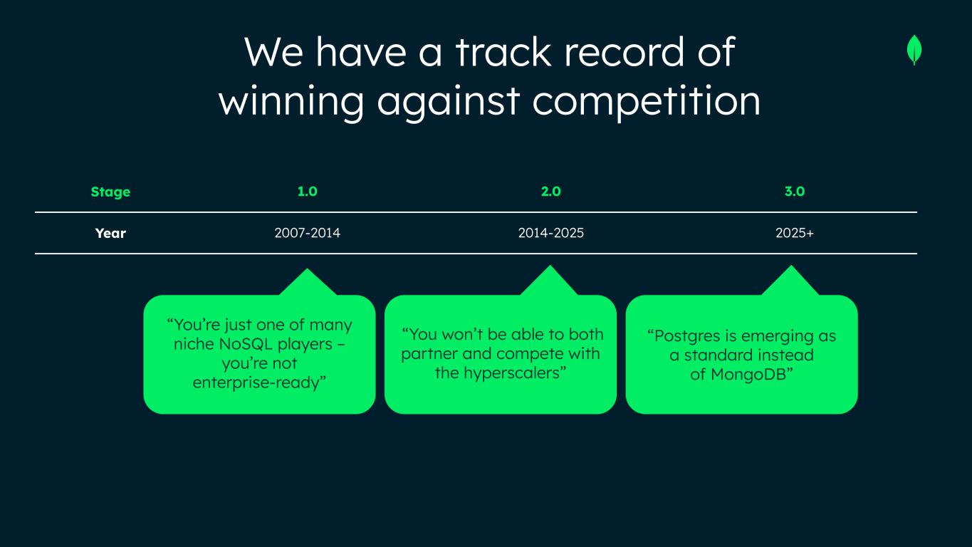 We have a track record of winning against competition Stage 1.0 2.0 3.0 Year 2007-2014 2014-2025 2025+ “You’re just one of many niche NoSQL players – you’re not enterprise-ready” “You won’t be able to both partner and compete with the hyperscalers” “Postgres is emerging as a standard instead of MongoDB”