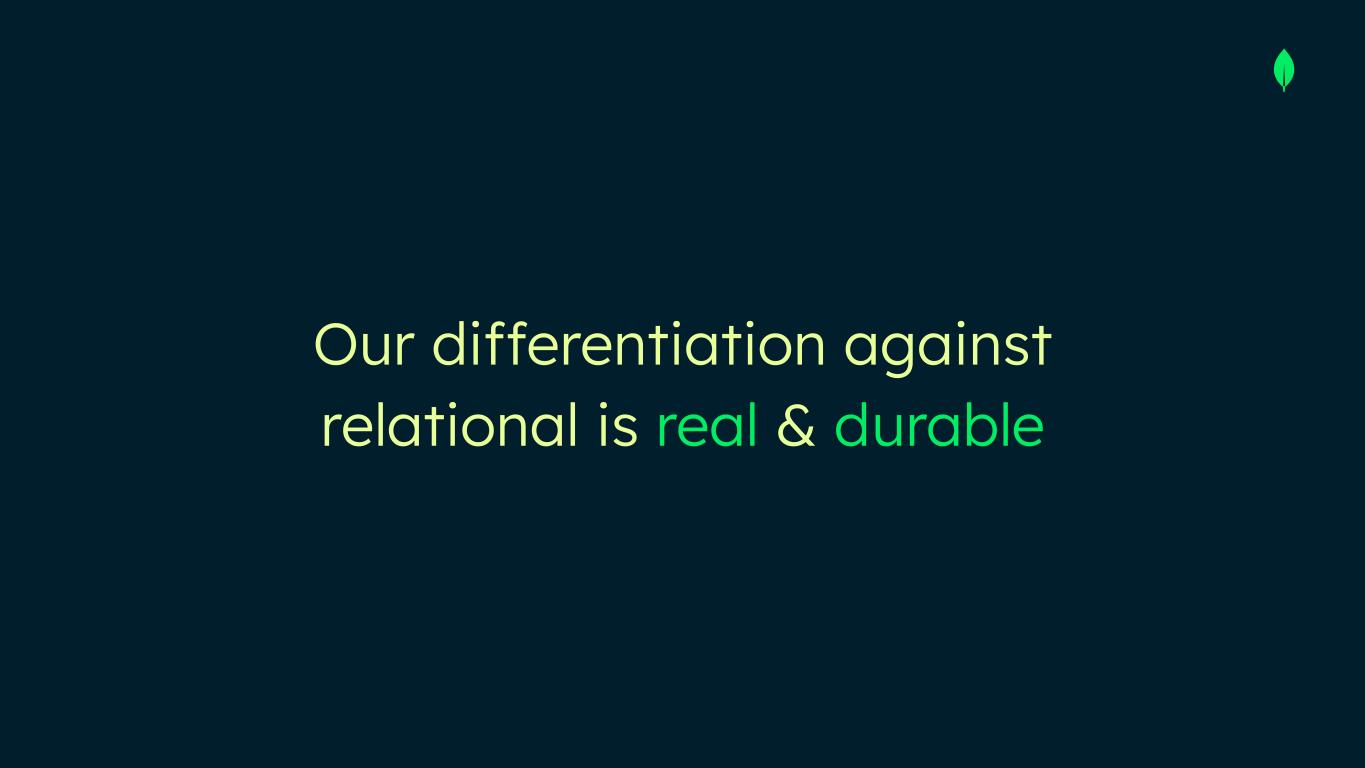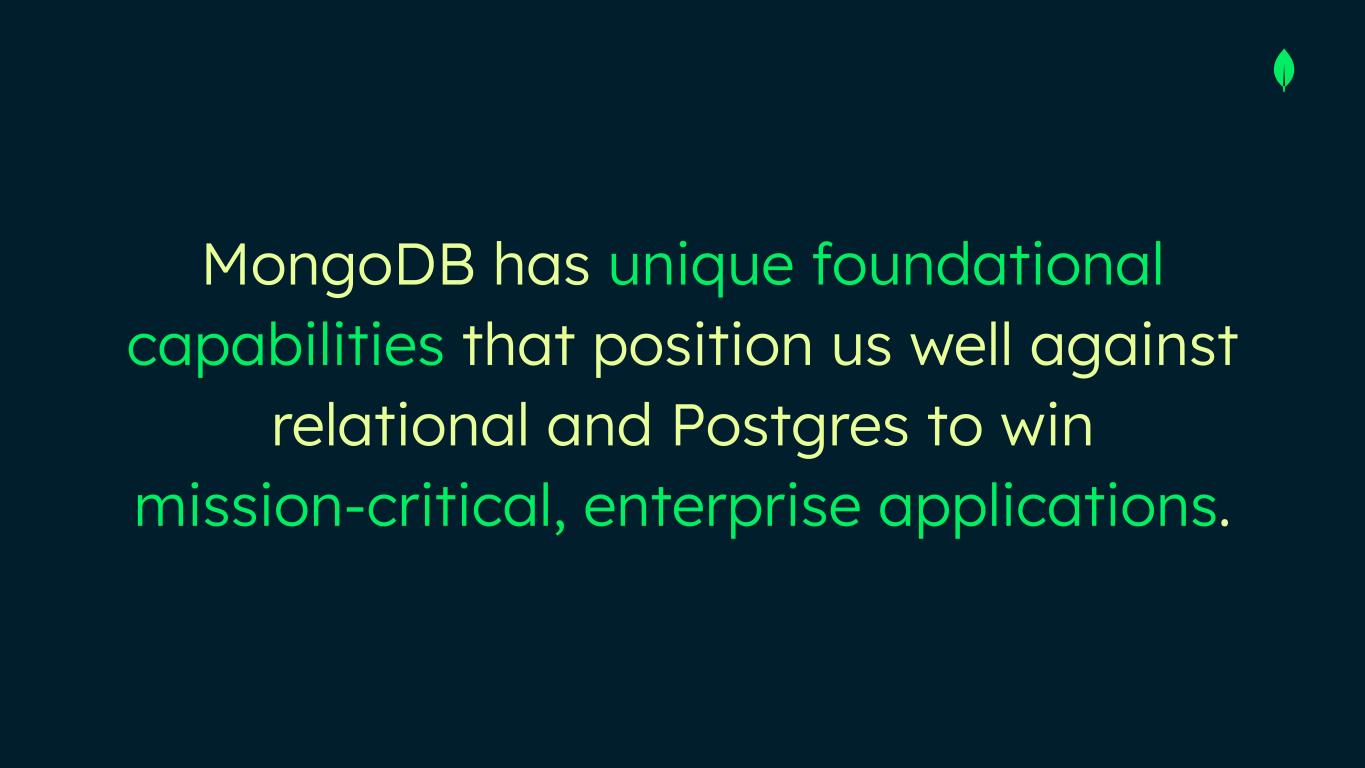 MongoDB has unique foundational capabilities that position us well against relational and Postgres to win mission-critical, enterprise applications.