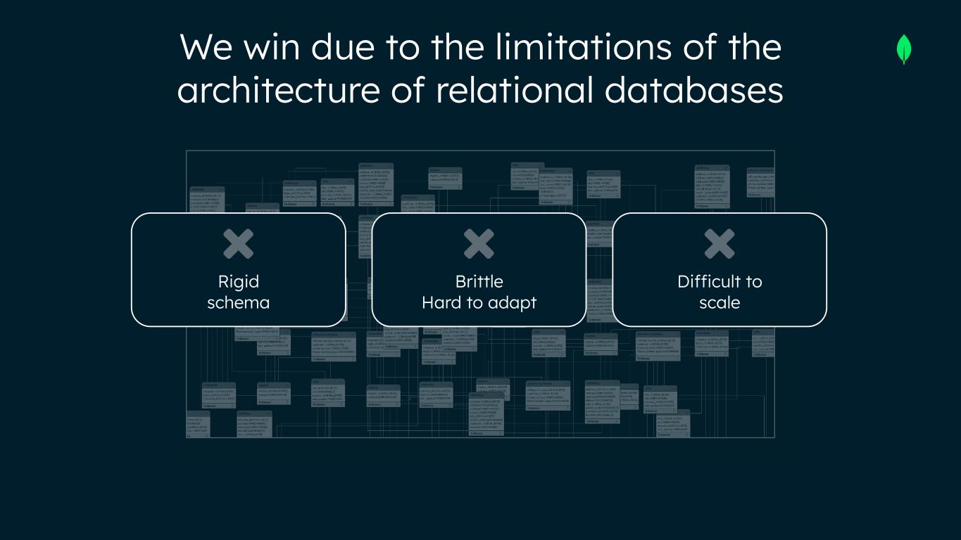 We win due to the limitations of the architecture of relational databases Rigid schema Brittle Hard to adapt Difficult to scale