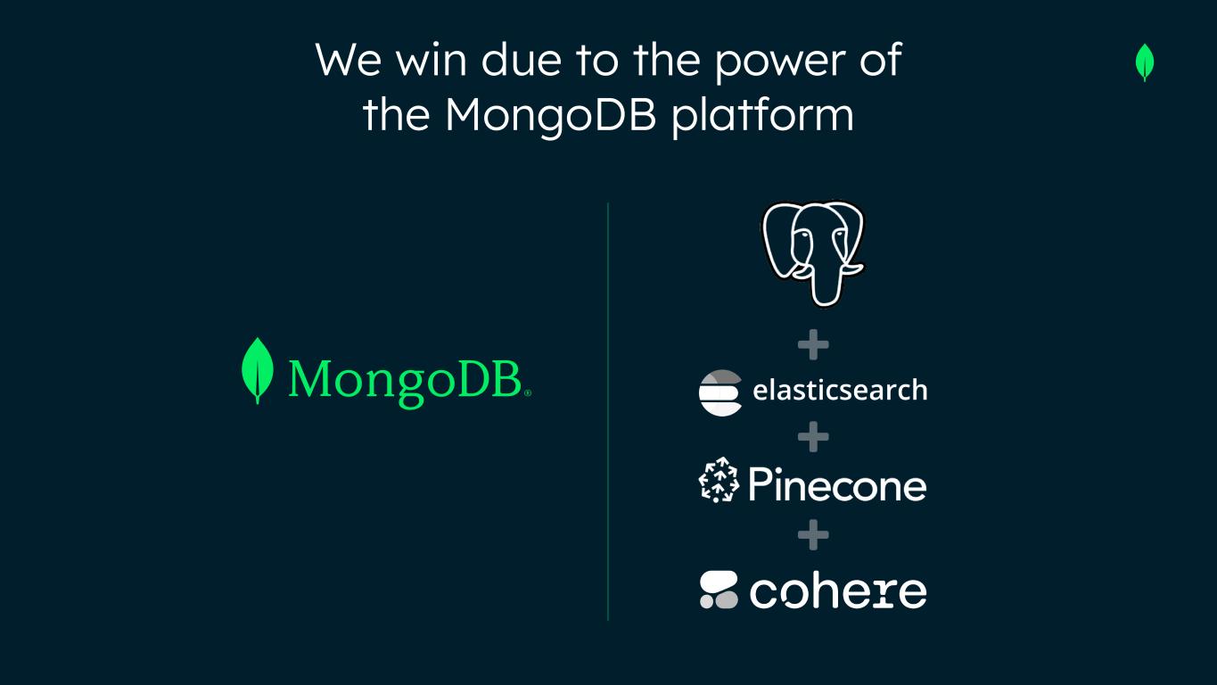 Why MongoDB wins With a strong base and multiple tailwinds, we’re confident in our ability to drive durable growth. RECAP Our market is massive and growing AI significantly expands our market AMP is an incremental growth opportunity It’s not a winner-take-all market, but our differentiation is durable