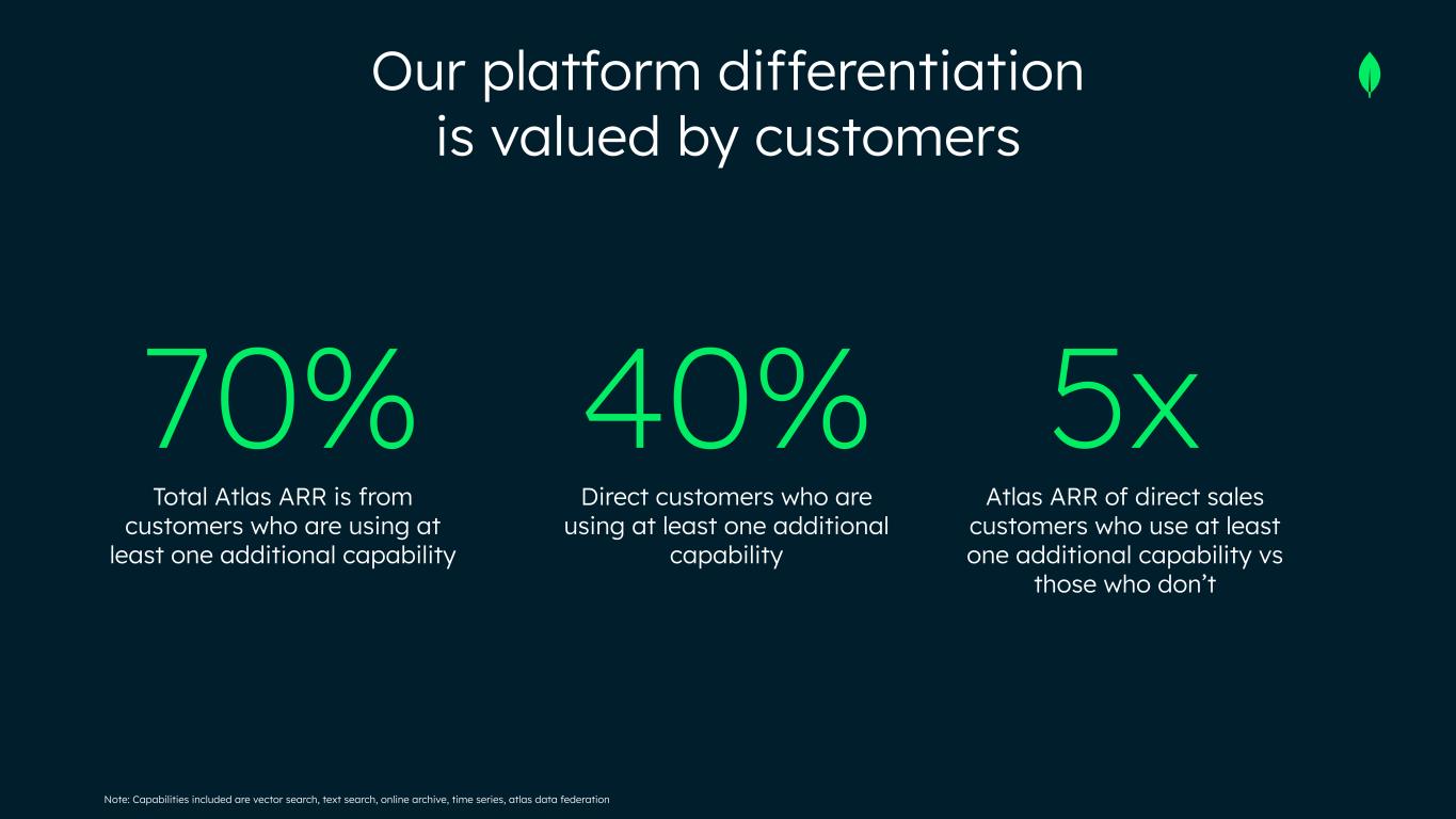 Note: Capabilities included are vector search, text search, online archive, time series, atlas data federation 70% Total Atlas ARR is from customers who are using at least one additional capability 5x Atlas ARR of direct sales customers who use at least one additional capability vs those who don’t 40% Direct customers who are using at least one additional capability Our platform differentiation is valued by customers