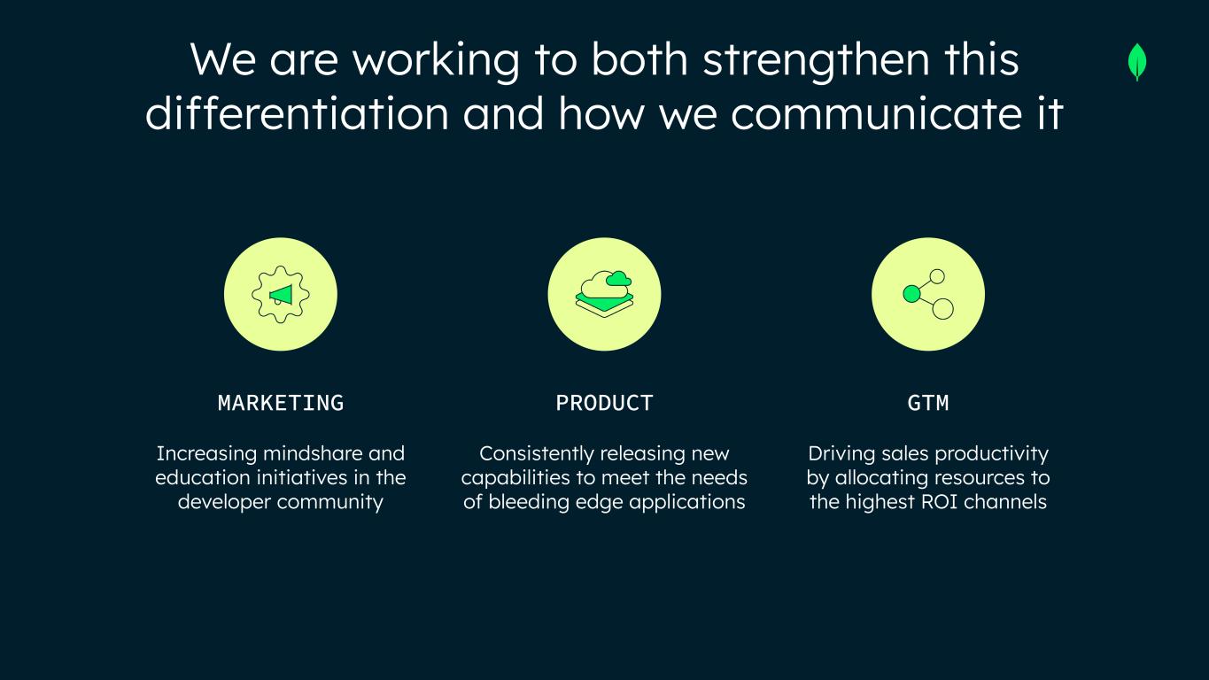 Driving sales productivity by allocating resources to the highest ROI channels Consistently releasing new capabilities to meet the needs of bleeding edge applications Increasing mindshare and education initiatives in the developer community We are working to both strengthen this differentiation and how we communicate it PRODUCT GTMMARKETING