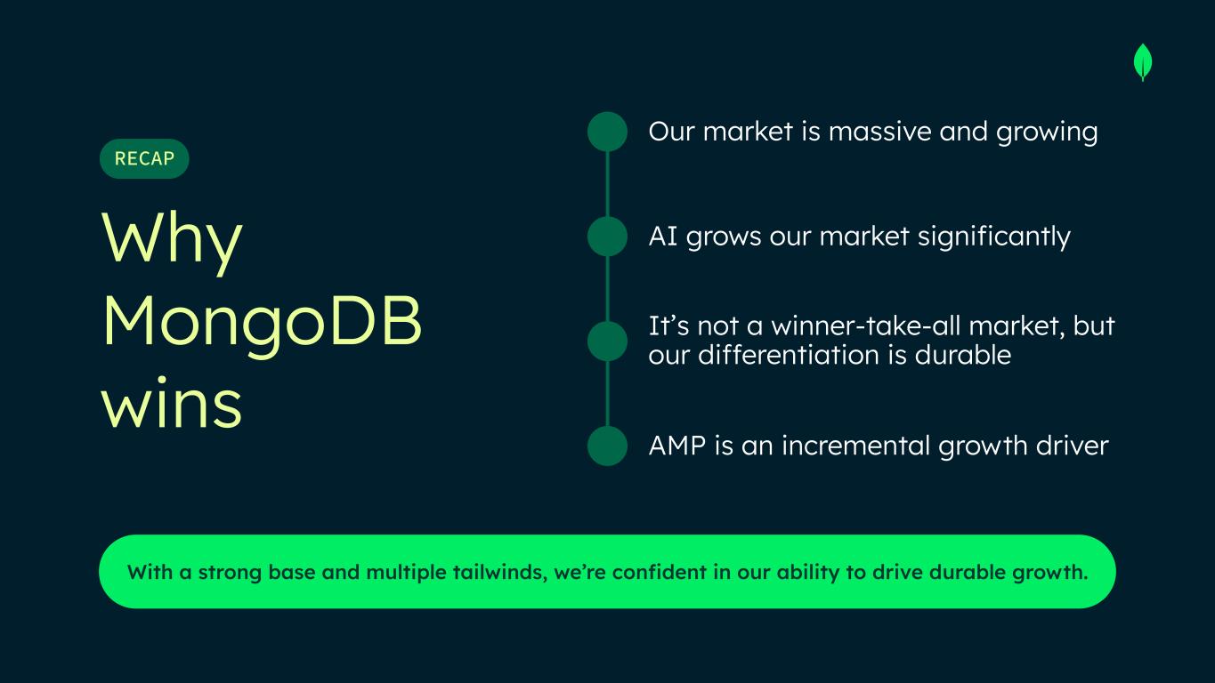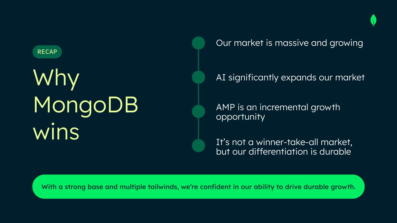 Why MongoDB wins With a strong base and multiple tailwinds, we’re confident in our ability to drive durable growth. RECAP Our market is massive and growing AI grows our market significantly It’s not a winner-take-all market, but our differentiation is durable AMP is an incremental growth driver
