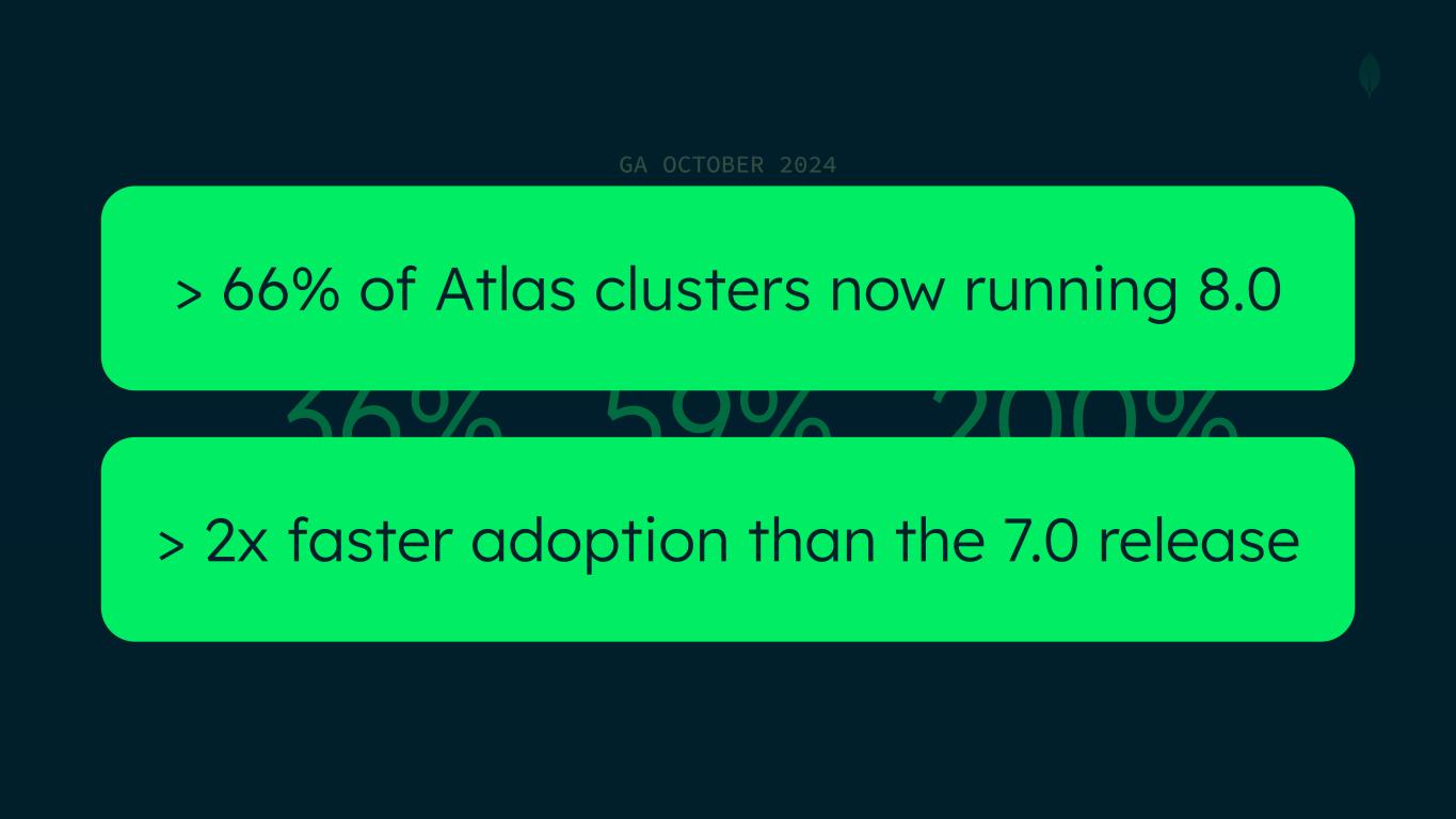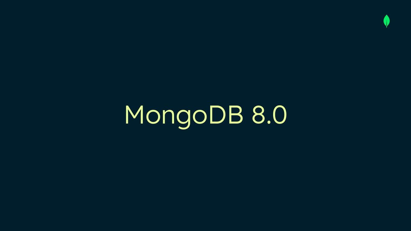 HIGHER UPDATE THROUGHPUT FASTER READS MongoDB 8.0 59%36% GA OCTOBER 2024 FASTER TIME SERIES READS 200% > 66% of Atlas clusters now running 8.0 > 2x faster adoption than the 7.0 release