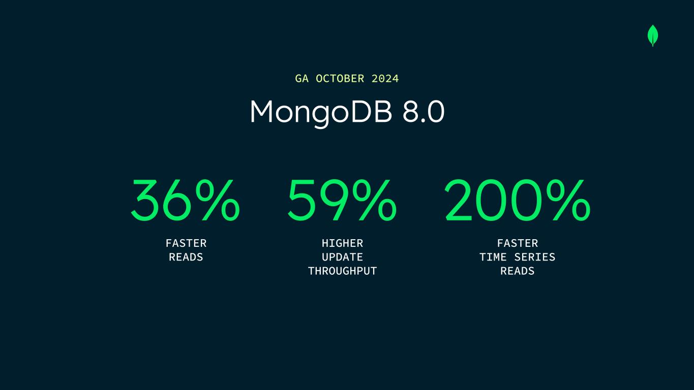 HIGHER UPDATE THROUGHPUT FASTER READS MongoDB 8.0 59%36% GA OCTOBER 2024 FASTER TIME SERIES READS 200%