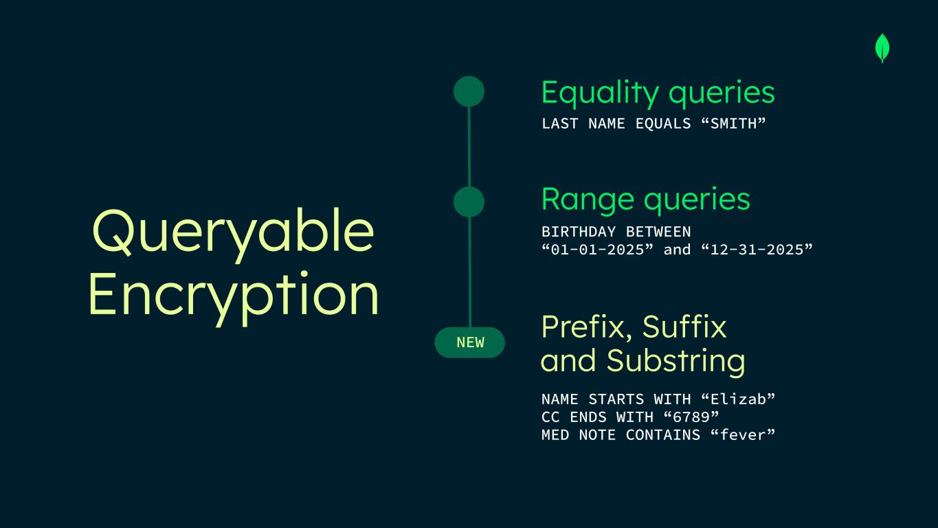 Queryable Encryption Equality queries NEW LAST NAME EQUALS “SMITH” BIRTHDAY BETWEEN “01-01-2025” and “12-31-2025” NAME STARTS WITH “Elizab” CC ENDS WITH “6789” MED NOTE CONTAINS “fever” Range queries Prefix, Suffix and Substring