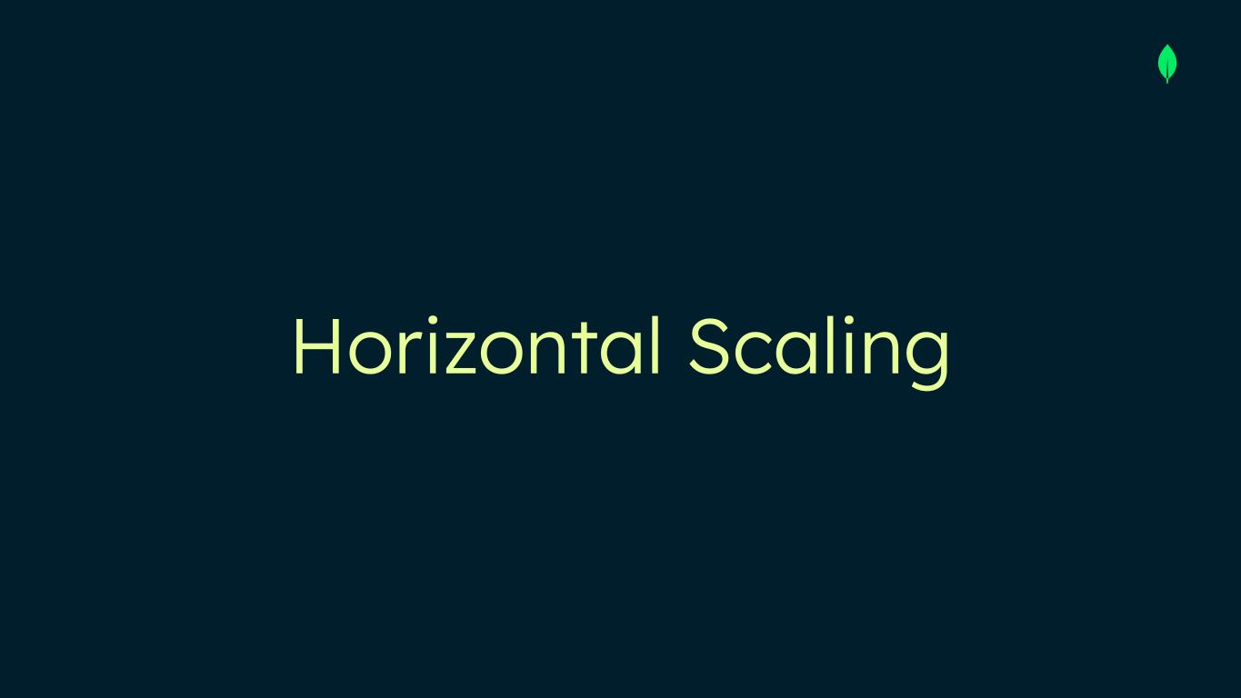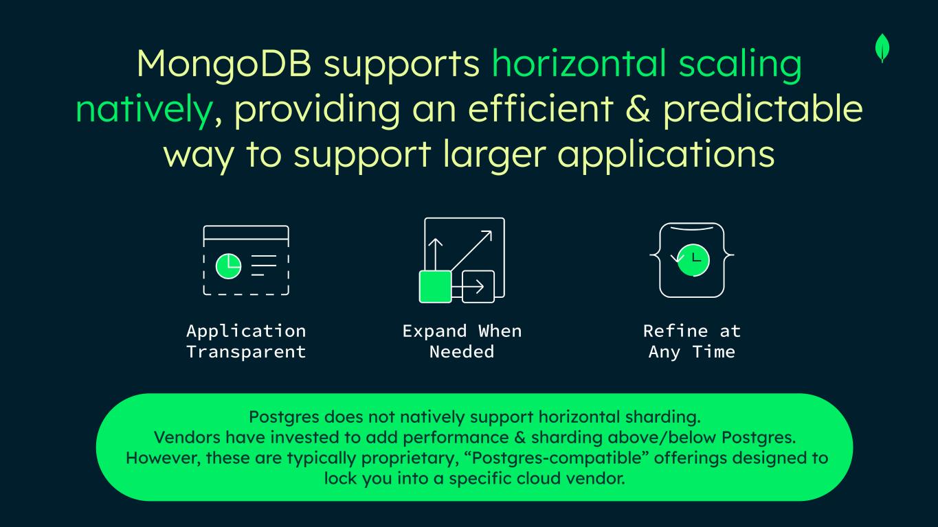 Postgres does not natively support horizontal sharding. Vendors have invested to add performance & sharding above/below Postgres. However, these are typically proprietary, “Postgres-compatible” offerings designed to lock you into a specific cloud vendor. MongoDB supports horizontal scaling natively, providing an efficient & predictable way to support larger applications Application Transparent Expand When Needed Refine at Any Time