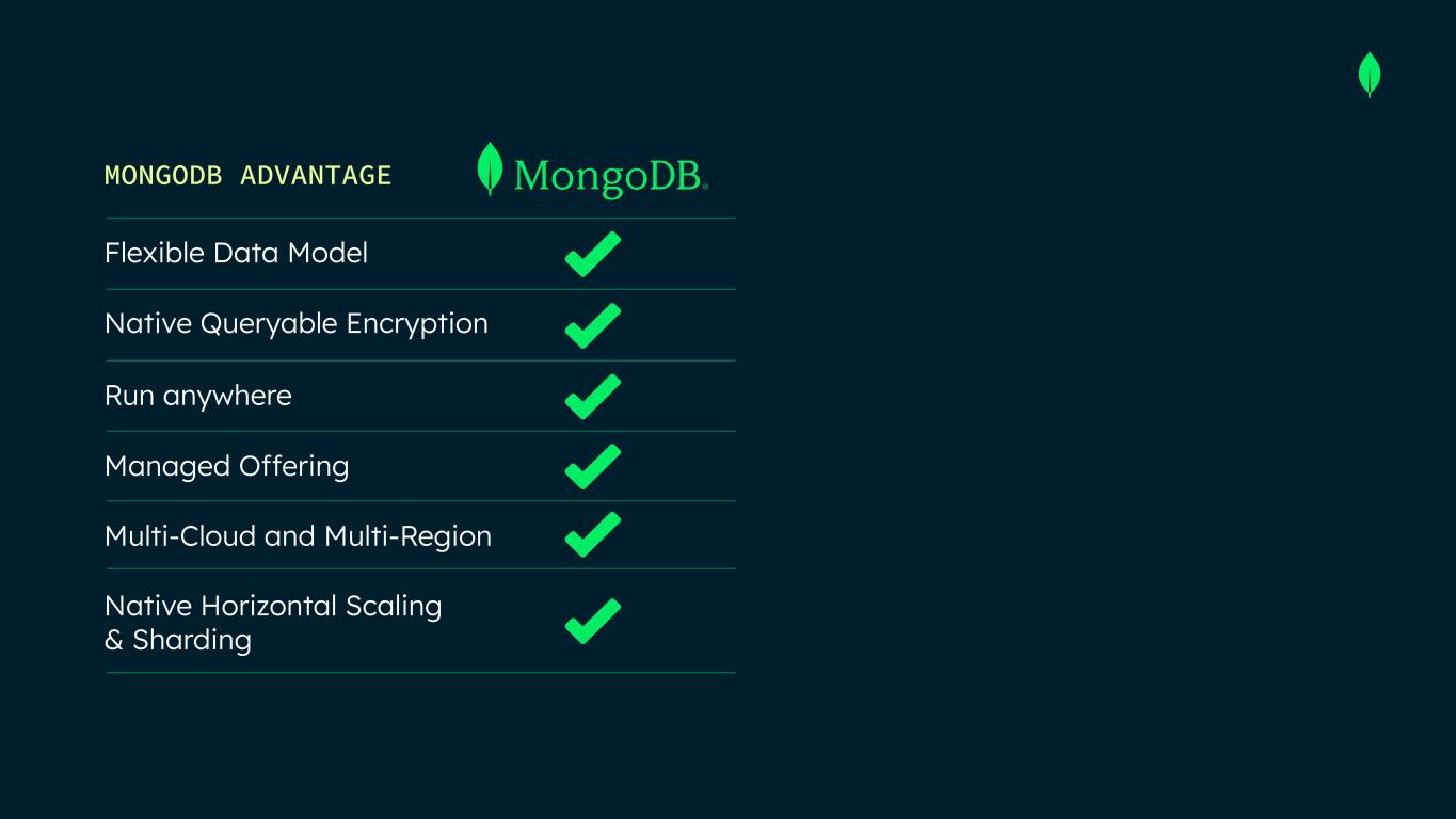 MONGODB ADVANTAGE Flexible Data Model Native Queryable Encryption Run anywhere Managed Offering Multi-Cloud and Multi-Region Native Horizontal Scaling & Sharding