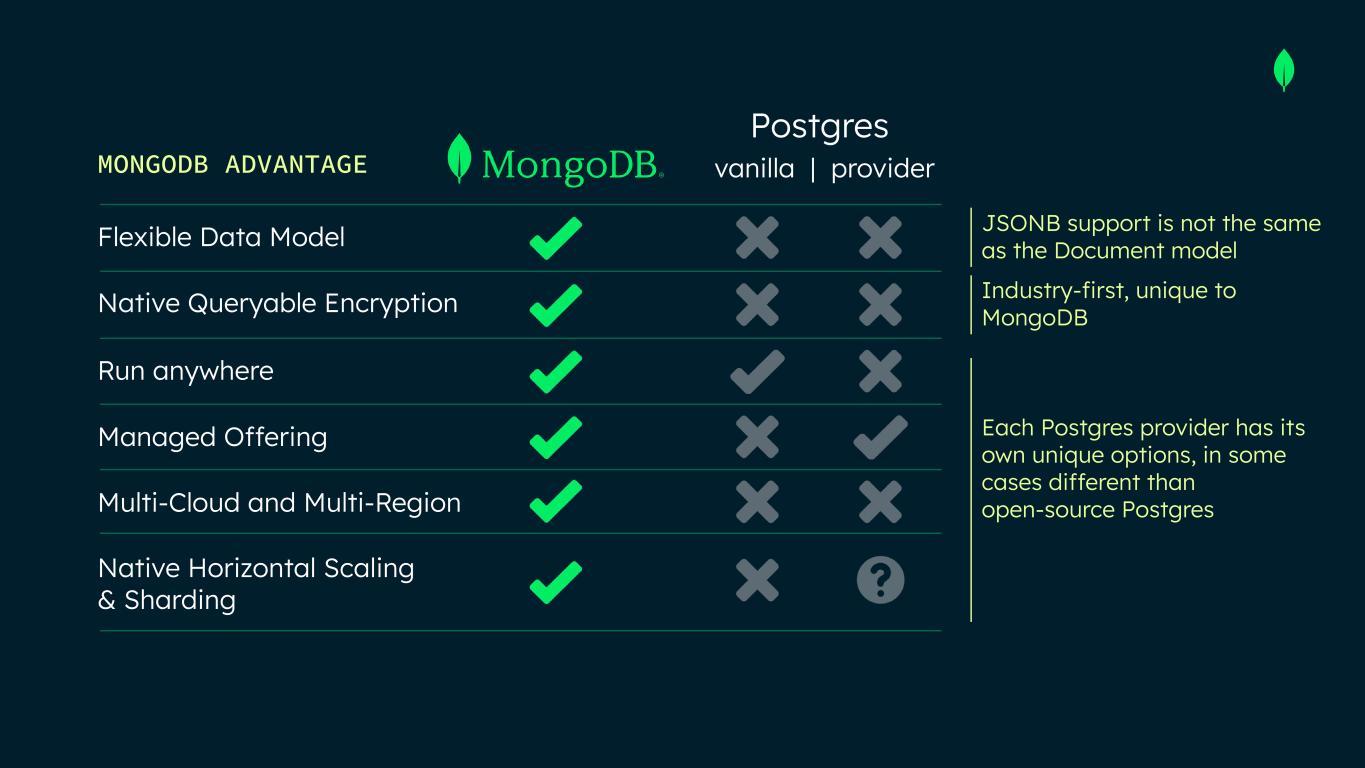 Postgres Each Postgres provider has its own unique options, in some cases different than open-source Postgres JSONB support is not the same as the Document model MONGODB ADVANTAGE Flexible Data Model Native Queryable Encryption Run anywhere Managed Offering Multi-Cloud and Multi-Region Native Horizontal Scaling & Sharding vanilla | provider Industry-first, unique to MongoDB