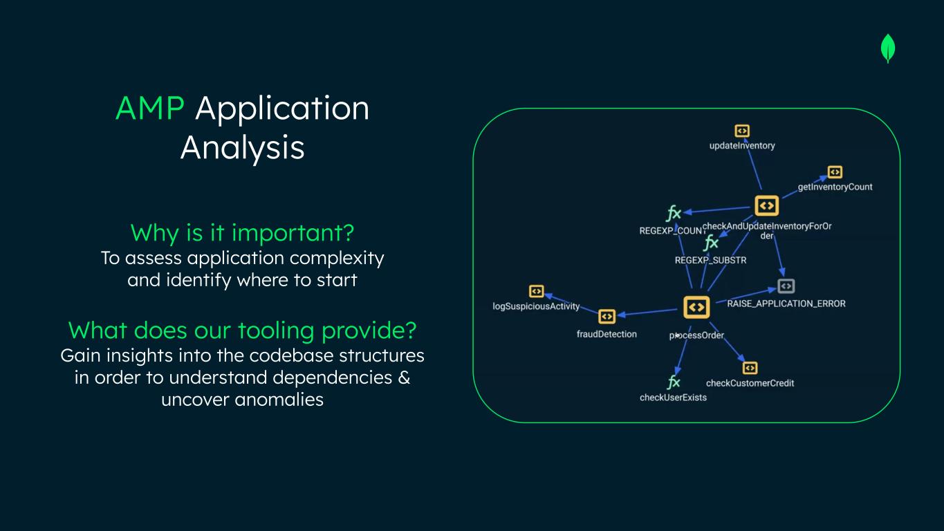 Why is it important? To assess application complexity and identify where to start What does our tooling provide? Gain insights into the codebase structures in order to understand dependencies & uncover anomalies AMP Application Analysis