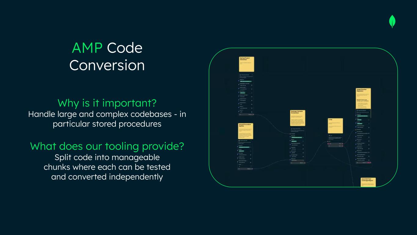 Why is it important? Handle large and complex codebases - in particular stored procedures What does our tooling provide? Split code into manageable chunks where each can be tested and converted independently AMP Code Conversion