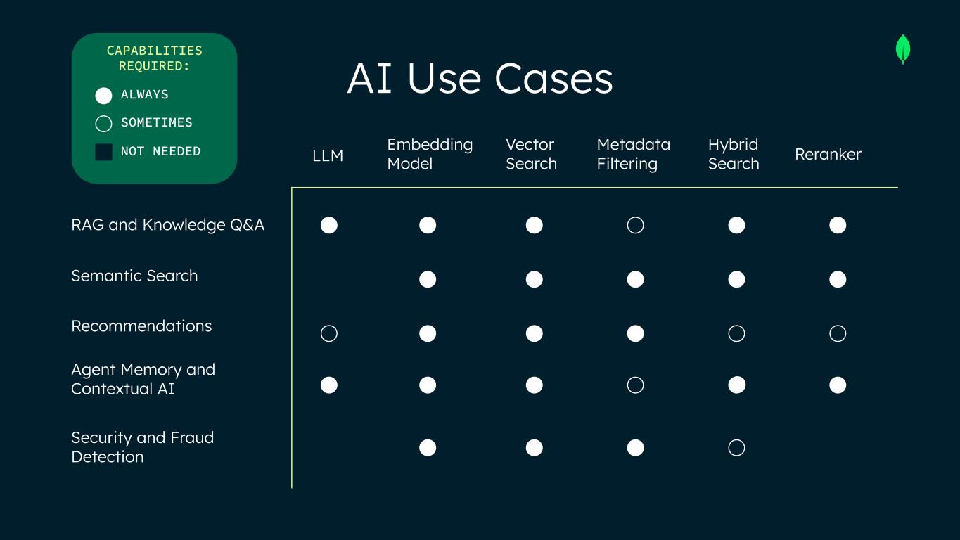 AI Use Cases RAG and Knowledge Q&A Semantic Search Recommendations Agent Memory and Contextual AI Security and Fraud Detection LLM Embedding Model Vector Search Metadata Filtering Hybrid Search Reranker ALWAYS SOMETIMES NOT NEEDED CAPABILITIES REQUIRED: