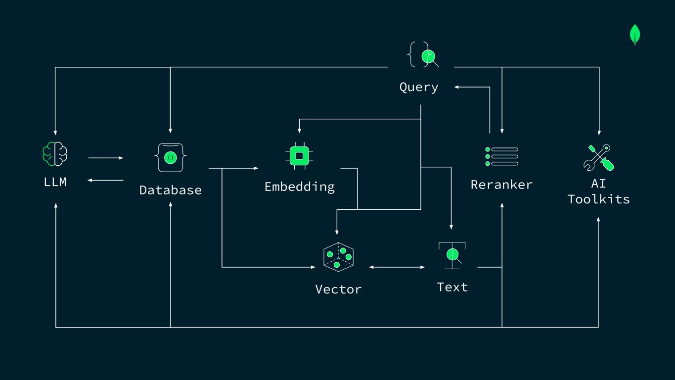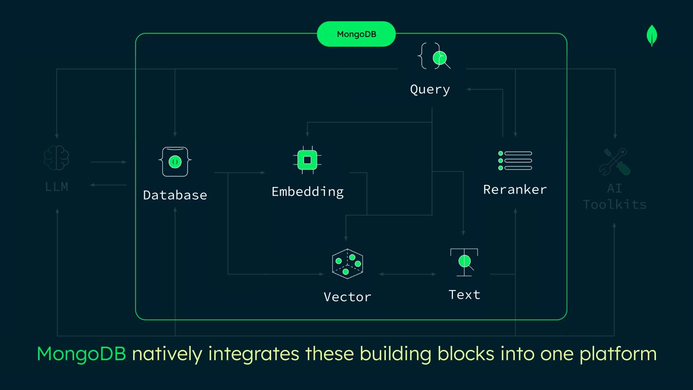 Vector Database Embedding Text RerankerLLM Query AI Toolkits MongoDB natively integrates these building blocks into one platform MongoDB