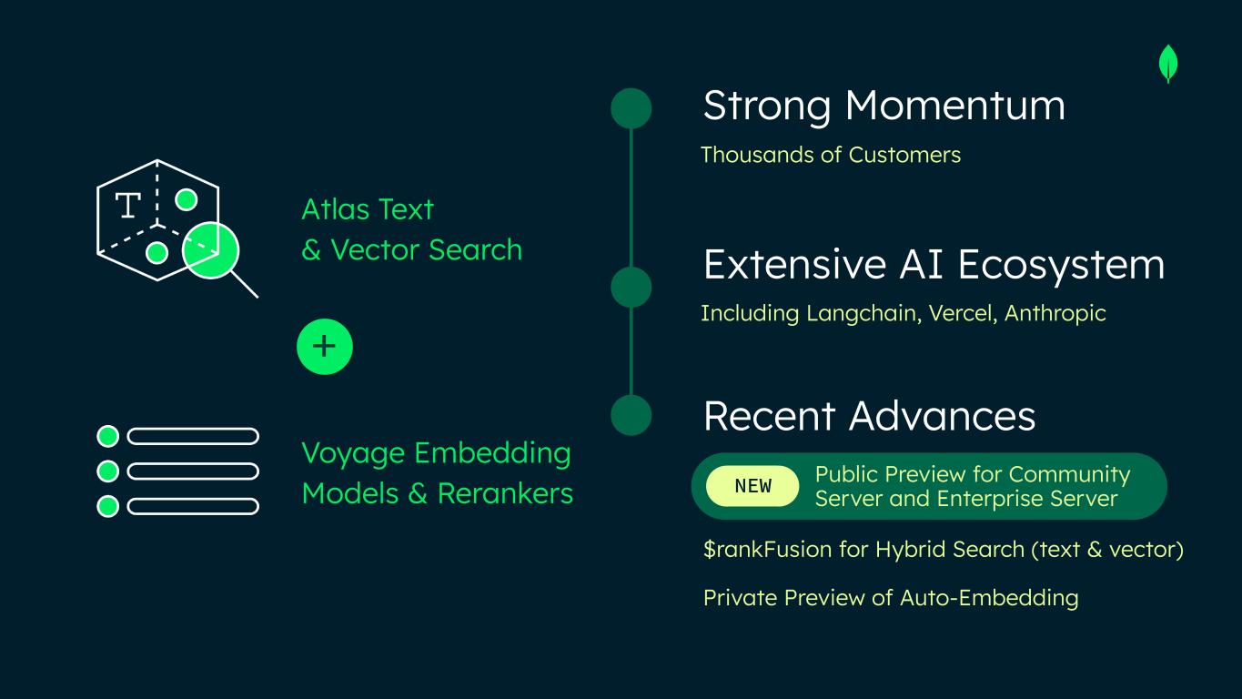 Strong Momentum Extensive AI Ecosystem Recent Advances Thousands of Customers Including Langchain, Vercel, Anthropic $rankFusion for Hybrid Search (text & vector) Private Preview of Auto-Embedding Atlas Text & Vector Search Voyage Embedding Models & Rerankers + NEW Public Preview for Community Server and Enterprise Server