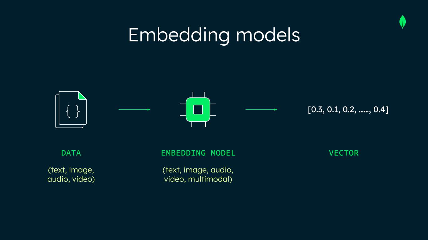 Embedding models [0.3, 0.1, 0.2, ……, 0.4] DATA (text, image, audio, video) EMBEDDING MODEL (text, image, audio, video, multimodal) VECTOR