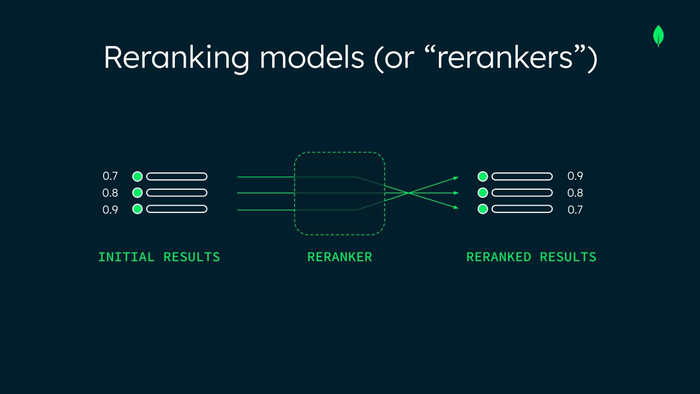 Reranking models (or “rerankers”) INITIAL RESULTS RERANKED RESULTS 0.9 0.8 0.7 0.7 0.8 0.9 RERANKER
