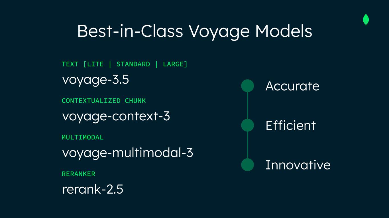 voyage-3.5 TEXT [LITE | STANDARD | LARGE] voyage-context-3 CONTEXTUALIZED CHUNK voyage-multimodal-3 MULTIMODAL rerank-2.5 RERANKER Best-in-Class Voyage Models Accurate Efficient Innovative