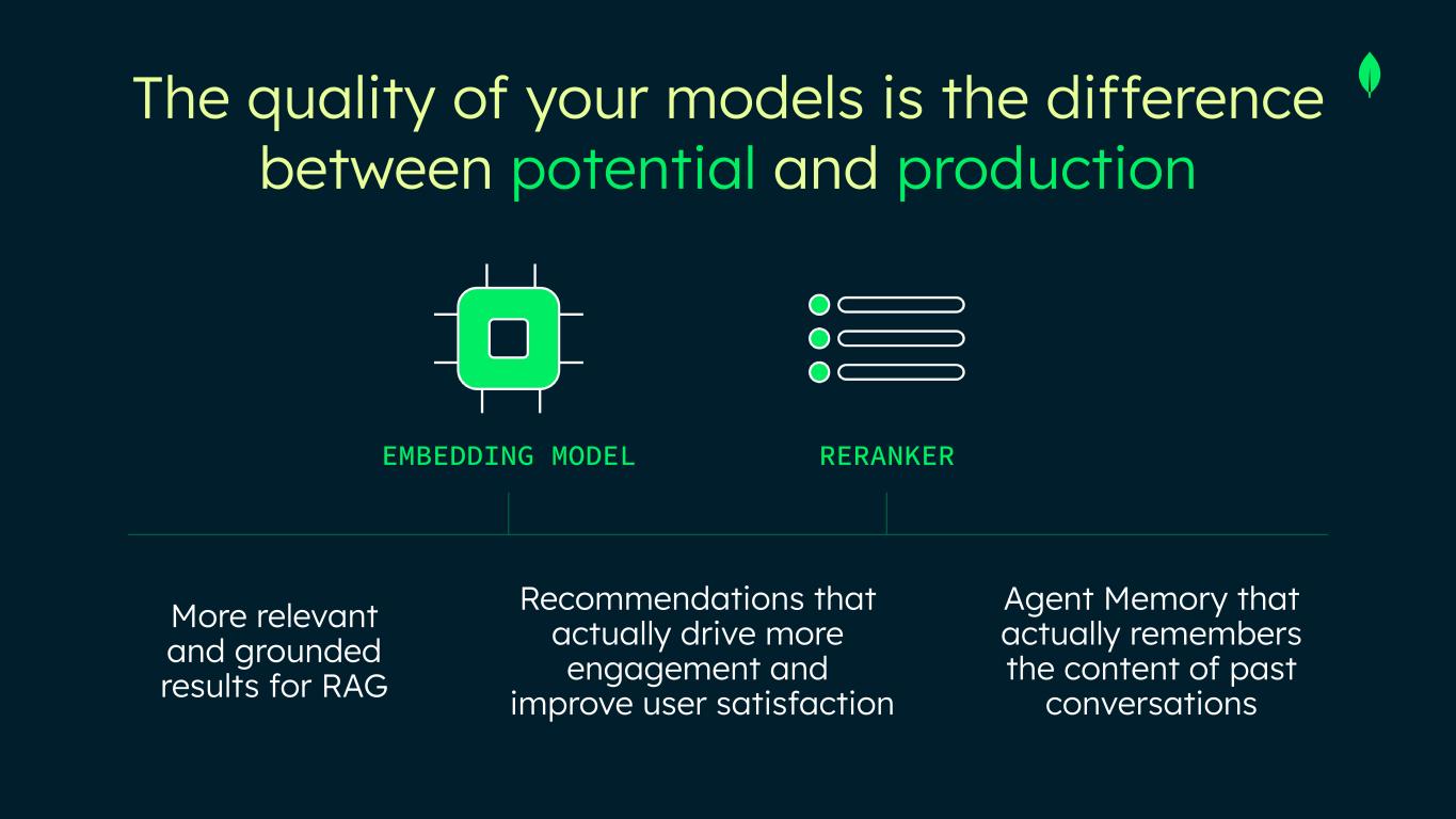 The quality of your models is the difference between potential and production EMBEDDING MODEL RERANKER More relevant and grounded results for RAG Recommendations that actually drive more engagement and improve user satisfaction Agent Memory that actually remembers the content of past conversations