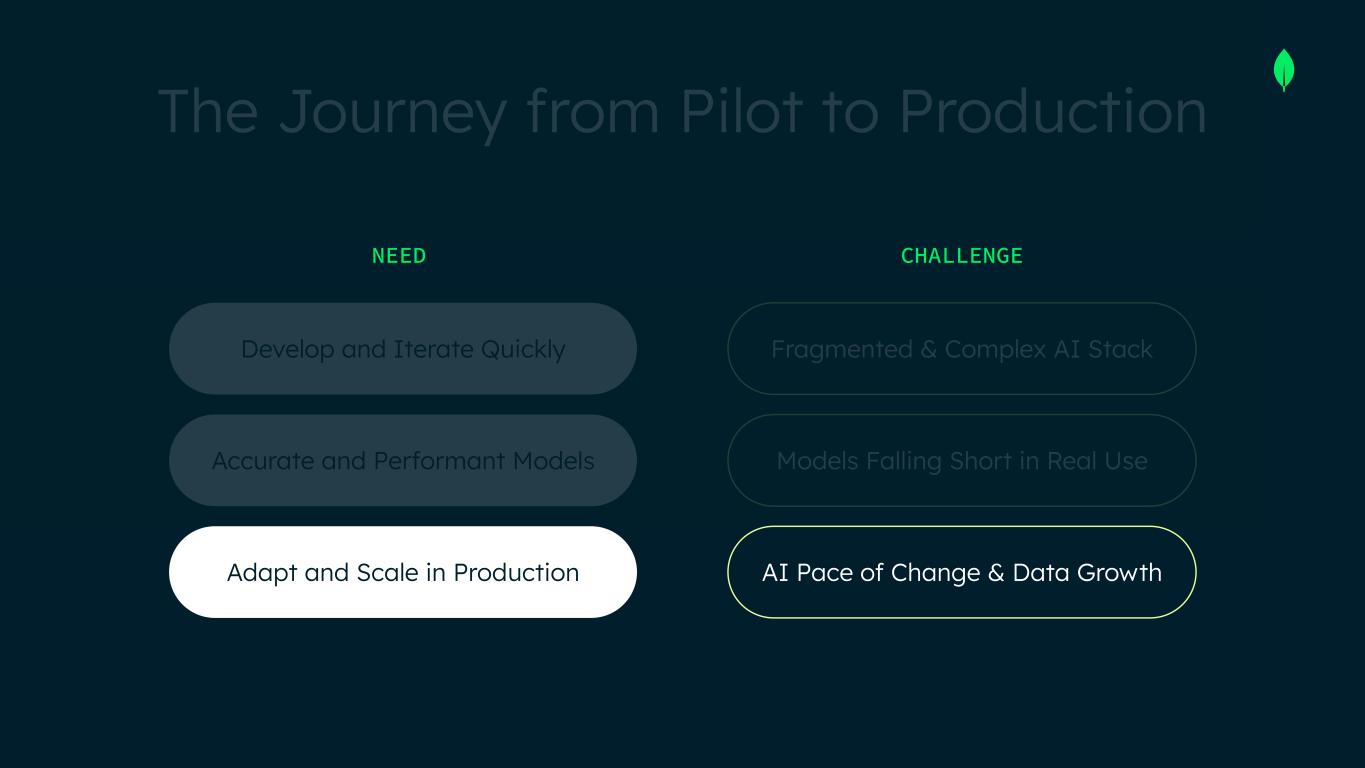 The Journey from Pilot to Production NEED CHALLENGE Develop and Iterate Quickly Accurate and Performant Models Adapt and Scale in Production Fragmented & Complex AI Stack Models Falling Short in Real Use AI Pace of Change & Data Growth