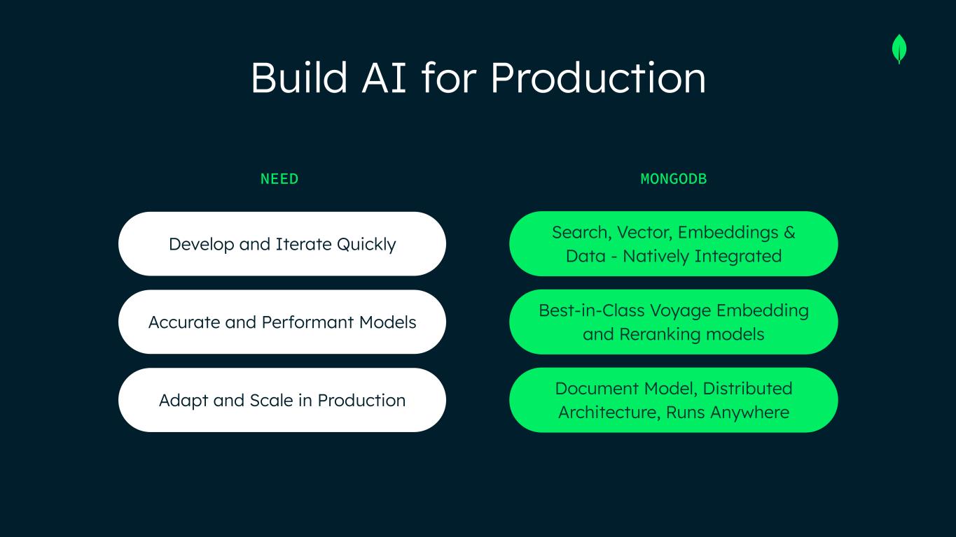 Build AI for Production NEED MONGODB Develop and Iterate Quickly Accurate and Performant Models Adapt and Scale in Production Search, Vector, Embeddings & Data - Natively Integrated Best-in-Class Voyage Embedding and Reranking models Document Model, Distributed Architecture, Runs Anywhere