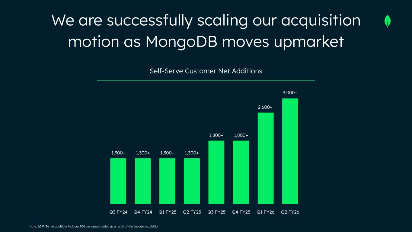 Note: Q2 FY26 net additions includes 300 customers added as a result of the Voyage acquisition We are successfully scaling our acquisition motion as MongoDB moves upmarket Self-Serve Customer Net Additions Q3 FY24 Q4 FY24 Q1 FY25 Q2 FY25 Q3 FY25 Q4 FY25 Q1 FY26 Q2 FY26 1,300+ 1,300+ 1,300+ 1,300+ 1,800+ 1,800+ 2,600+ 3,000+