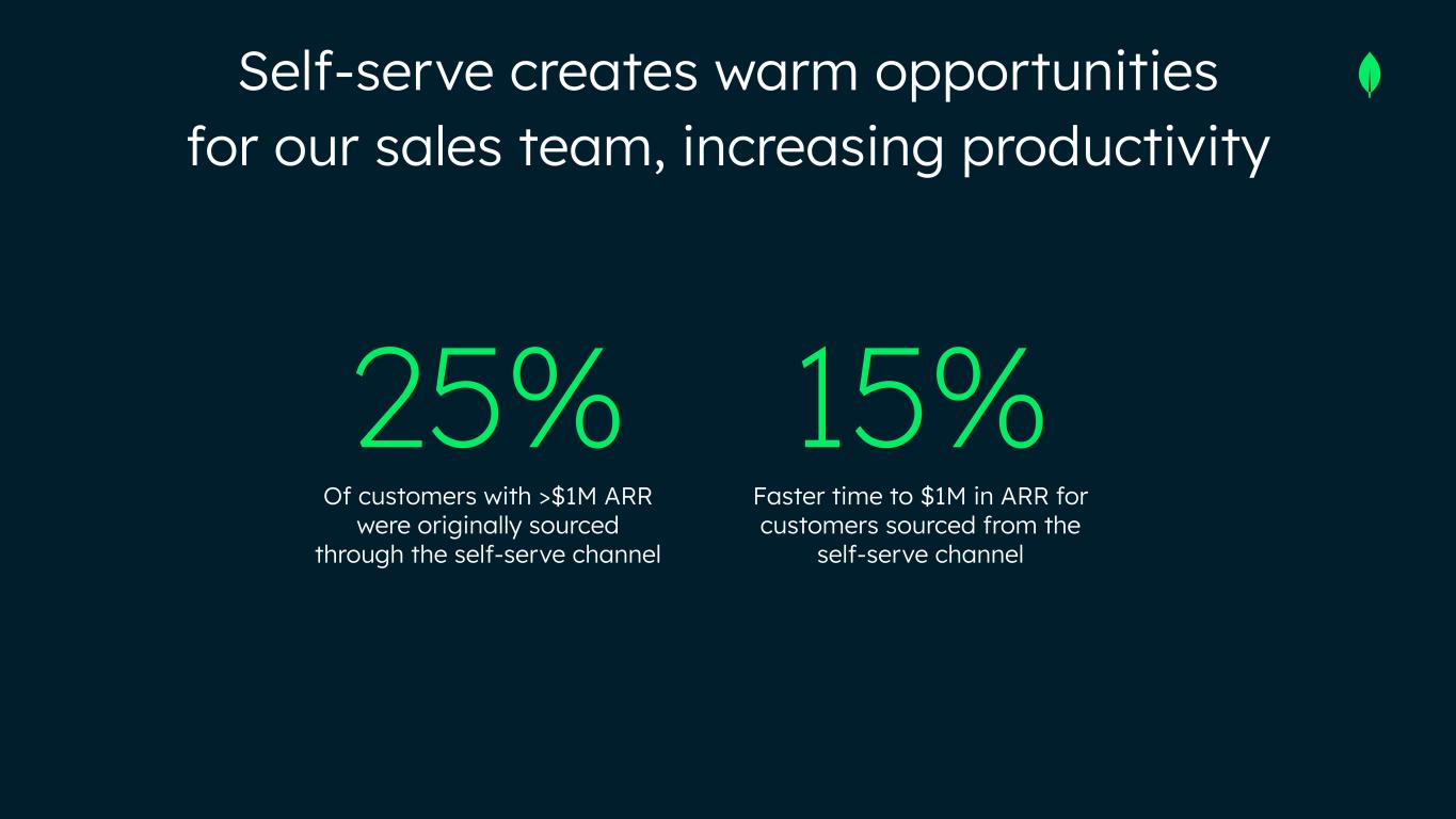 25% Of customers with >$1M ARR were originally sourced through the self-serve channel 15% Faster time to $1M in ARR for customers sourced from the self-serve channel Self-serve creates warm opportunities for our sales team, increasing productivity