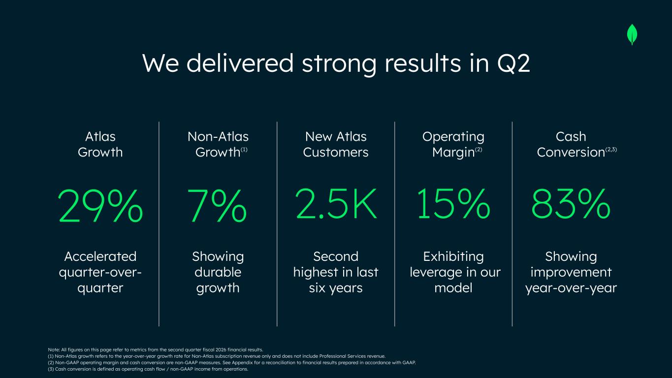 Atlas Growth Non-Atlas Growth New Atlas Customers Operating Margin Cash Conversion 29% 7% 2.5K 15% 83% Accelerated quarter-over- quarter Showing durable growth Second highest in last six years Exhibiting leverage in our model Showing improvement year-over-year Note: All figures on this page refer to metrics from the second quarter fiscal 2026 financial results. (1) Non-Atlas growth refers to the year-over-year growth rate for Non-Atlas subscription revenue only and does not include Professional Services revenue. (2) Non-GAAP operating margin and cash conversion are non-GAAP measures. See Appendix for a reconciliation to financial results prepared in accordance with GAAP. (3) Cash conversion is defined as operating cash flow / non-GAAP income from operations. (1) (2,3)(2) We delivered strong results in Q2