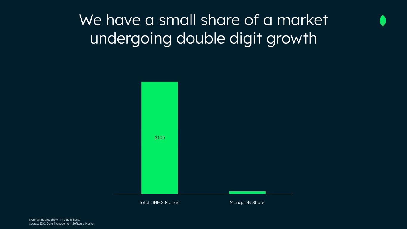 Note: All figures shown in USD billions. Source: IDC, Data Management Software Market. We have a small share of a market undergoing double digit growth Total DBMS Market MongoDB Share $105