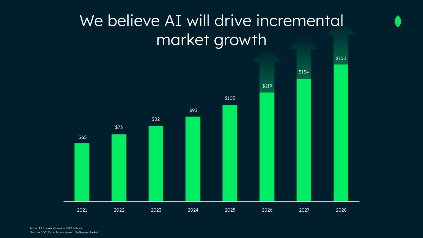$150 $134 $119 $105 $93 $82 $73 $65 2021 2022 2023 2024 2025 2026 2027 2028 We believe AI will drive incremental market growth Note: All figures shown in USD billions. Source: IDC, Data Management Software Market.