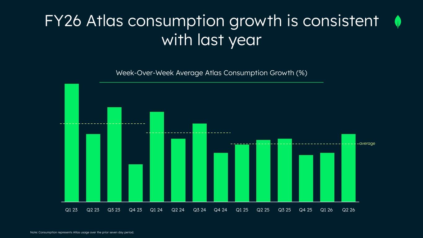 Q1 23 Q2 23 Q3 23 Q4 23 Q1 24 Q2 24 Q3 24 Q4 24 Q1 25 Q2 25 Q3 25 Q4 25 Q1 26 Q2 26 average Week-Over-Week Average Atlas Consumption Growth (%) Note: Consumption represents Atlas usage over the prior seven day period. FY26 Atlas consumption growth is consistent with last year