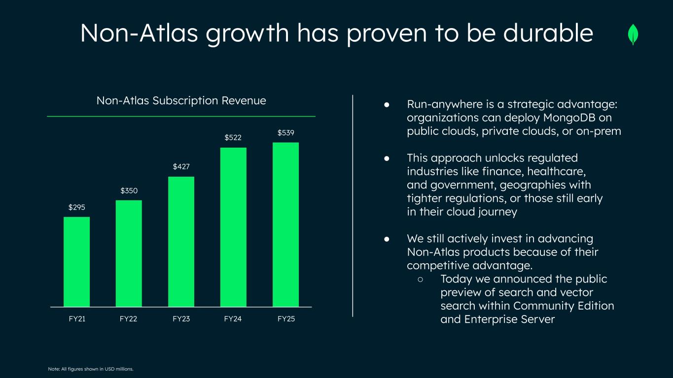 Note: All figures shown in USD millions. ● Run-anywhere is a strategic advantage: organizations can deploy MongoDB on public clouds, private clouds, or on-prem ● This approach unlocks regulated industries like finance, healthcare, and government, geographies with tighter regulations, or those still early in their cloud journey ● We still actively invest in advancing Non-Atlas products because of their competitive advantage. ○ Today we announced the public preview of search and vector search within Community Edition and Enterprise Server Non-Atlas Subscription Revenue $295 $350 $427 $522 $539 FY21 FY22 FY23 FY24 FY25 Non-Atlas growth has proven to be durable