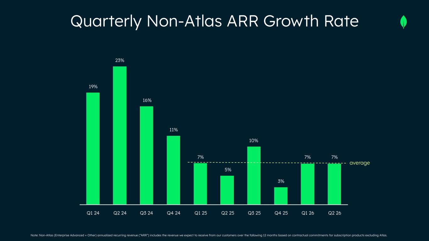 Note: Non-Atlas (Enterprise Advanced + Other) annualized recurring revenue (“ARR”) includes the revenue we expect to receive from our customers over the following 12 months based on contractual commitments for subscription products excluding Atlas. average Q1 24 Q2 24 Q3 24 Q4 24 Q1 25 Q2 25 Q3 25 Q4 25 Q1 26 Q2 26 19% 23% 16% 11% 7% 5% 10% 3% 7% 7% Quarterly Non-Atlas ARR Growth Rate