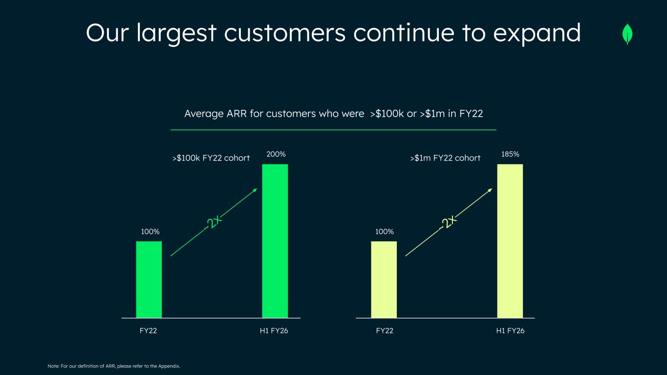 Average ARR for customers who were >$100k or >$1m in FY22 >$1m FY22 cohort ~2x FY22 H1 FY26 >$100k FY22 cohort ~2x FY22 H1 FY26 100% 200% 100% 185% Note: For our definition of ARR, please refer to the Appendix. Our largest customers continue to expand
