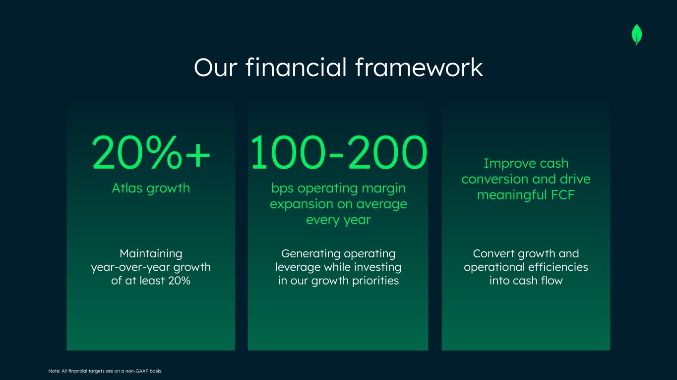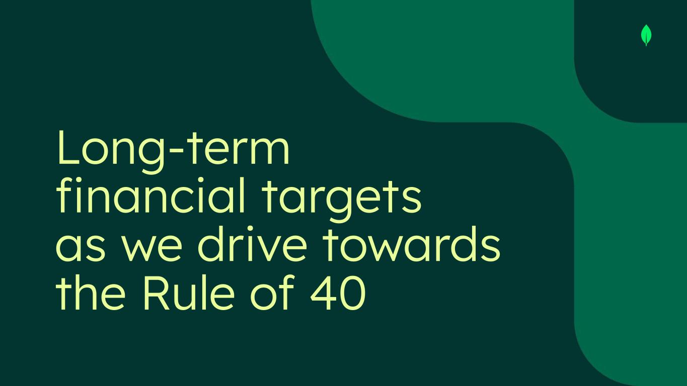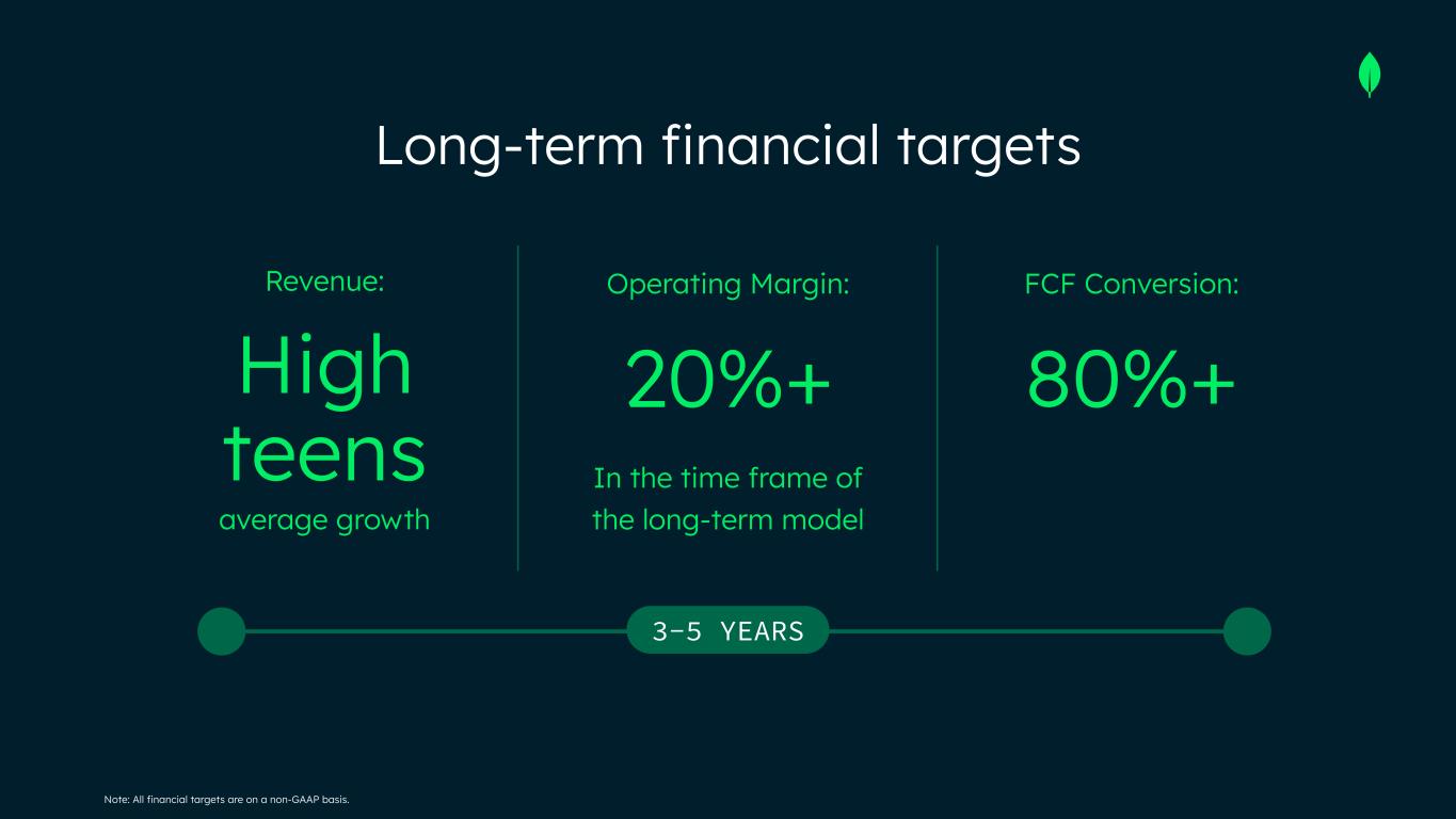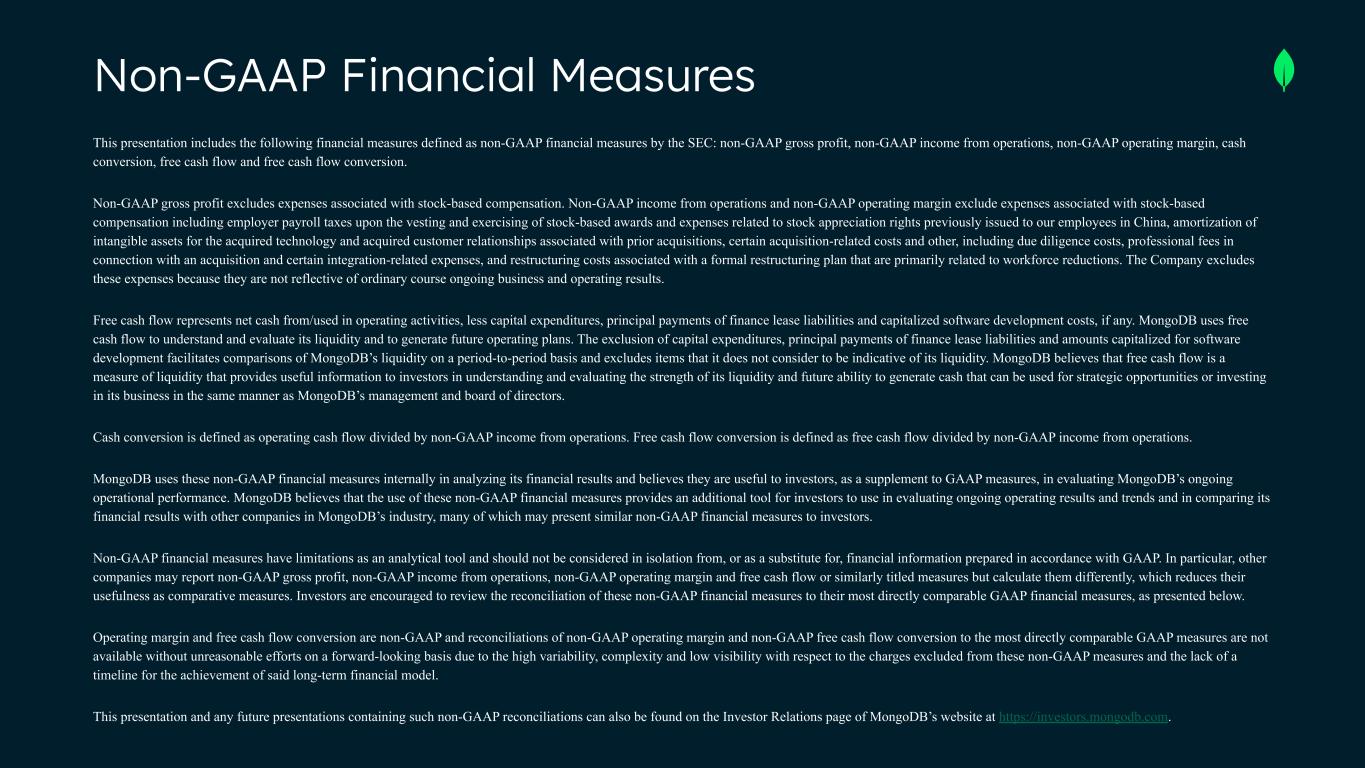 Non-GAAP Financial Measures This presentation includes the following financial measures defined as non-GAAP financial measures by the SEC: non-GAAP gross profit, non-GAAP income from operations, non-GAAP operating margin, cash conversion, free cash flow and free cash flow conversion. Non-GAAP gross profit excludes expenses associated with stock-based compensation. Non-GAAP income from operations and non-GAAP operating margin exclude expenses associated with stock-based compensation including employer payroll taxes upon the vesting and exercising of stock-based awards and expenses related to stock appreciation rights previously issued to our employees in China, amortization of intangible assets for the acquired technology and acquired customer relationships associated with prior acquisitions, certain acquisition-related costs and other, including due diligence costs, professional fees in connection with an acquisition and certain integration-related expenses, and restructuring costs associated with a formal restructuring plan that are primarily related to workforce reductions. The Company excludes these expenses because they are not reflective of ordinary course ongoing business and operating results. Free cash flow represents net cash from/used in operating activities, less capital expenditures, principal payments of finance lease liabilities and capitalized software development costs, if any. MongoDB uses free cash flow to understand and evaluate its liquidity and to generate future operating plans. The exclusion of capital expenditures, principal payments of finance lease liabilities and amounts capitalized for software development facilitates comparisons of MongoDB’s liquidity on a period-to-period basis and excludes items that it does not consider to be indicative of its liquidity. MongoDB believes that free cash flow is a measure of liquidity that provides useful information to investors in understanding and evaluating the strength of its liquidity and future ability to generate cash that can be used for strategic opportunities or investing in its business in the same manner as MongoDB’s management and board of directors. Cash conversion is defined as operating cash flow divided by non-GAAP income from operations. Free cash flow conversion is defined as free cash flow divided by non-GAAP income from operations. MongoDB uses these non-GAAP financial measures internally in analyzing its financial results and believes they are useful to investors, as a supplement to GAAP measures, in evaluating MongoDB’s ongoing operational performance. MongoDB believes that the use of these non-GAAP financial measures provides an additional tool for investors to use in evaluating ongoing operating results and trends and in comparing its financial results with other companies in MongoDB’s industry, many of which may present similar non-GAAP financial measures to investors. Non-GAAP financial measures have limitations as an analytical tool and should not be considered in isolation from, or as a substitute for, financial information prepared in accordance with GAAP. In particular, other companies may report non-GAAP gross profit, non-GAAP income from operations, non-GAAP operating margin and free cash flow or similarly titled measures but calculate them differently, which reduces their usefulness as comparative measures. Investors are encouraged to review the reconciliation of these non-GAAP financial measures to their most directly comparable GAAP financial measures, as presented below. Operating margin and free cash flow conversion are non-GAAP and reconciliations of non-GAAP operating margin and non-GAAP free cash flow conversion to the most directly comparable GAAP measures are not available without unreasonable efforts on a forward-looking basis due to the high variability, complexity and low visibility with respect to the charges excluded from these non-GAAP measures and the lack of a timeline for the achievement of said long-term financial model. This presentation and any future presentations containing such non-GAAP reconciliations can also be found on the Investor Relations page of MongoDB’s website at https://investors.mongodb.com.