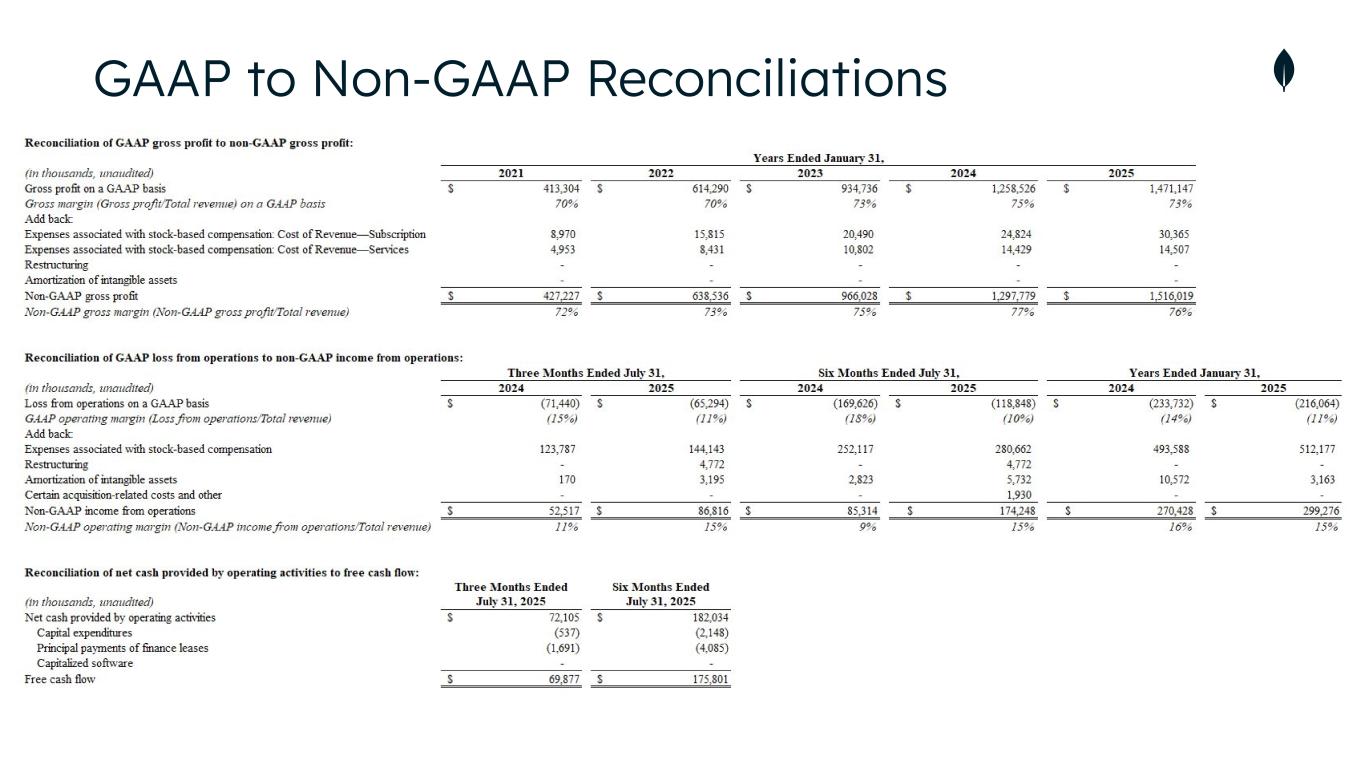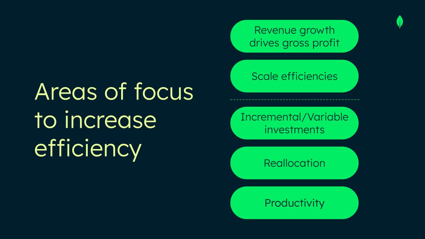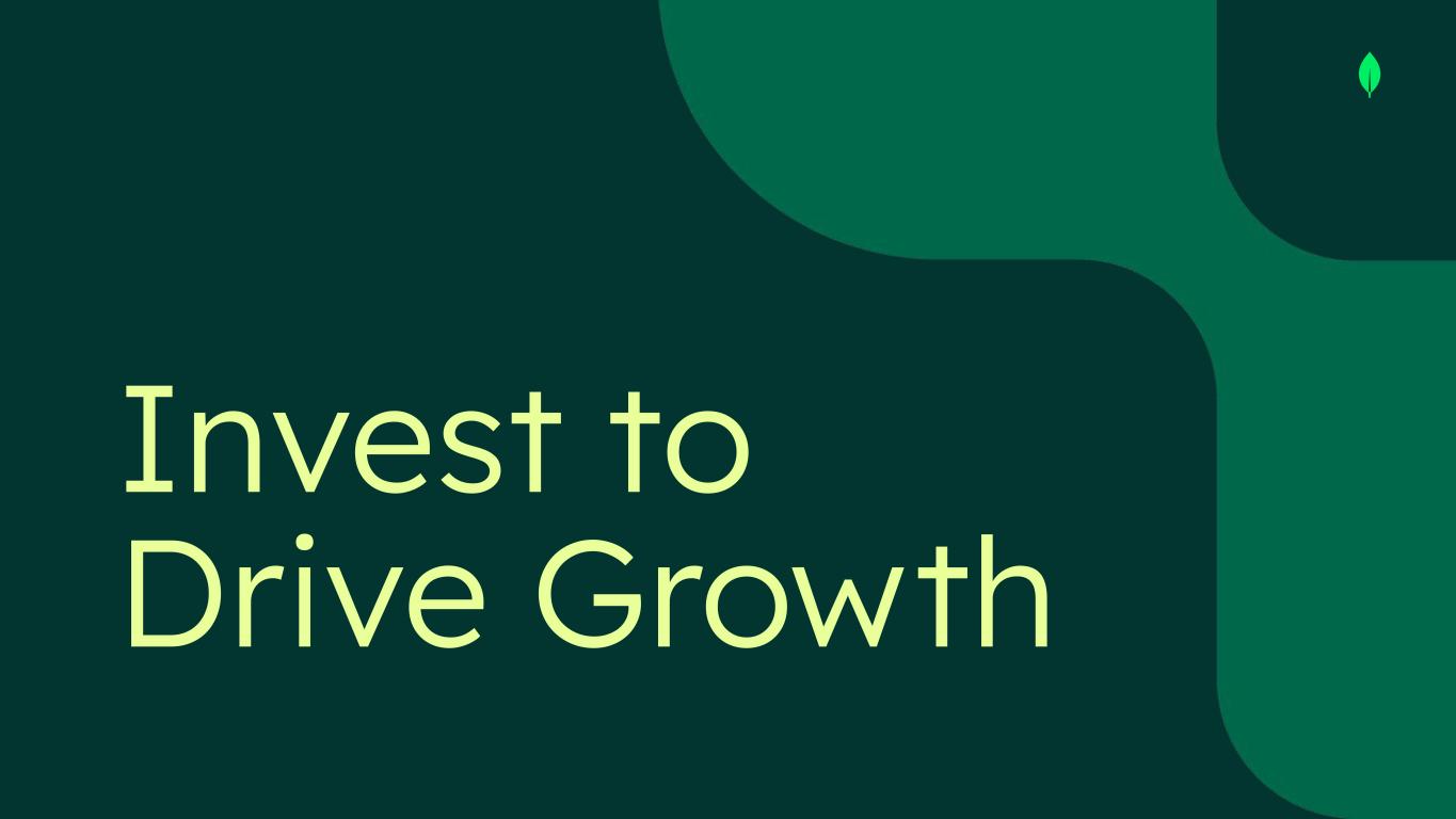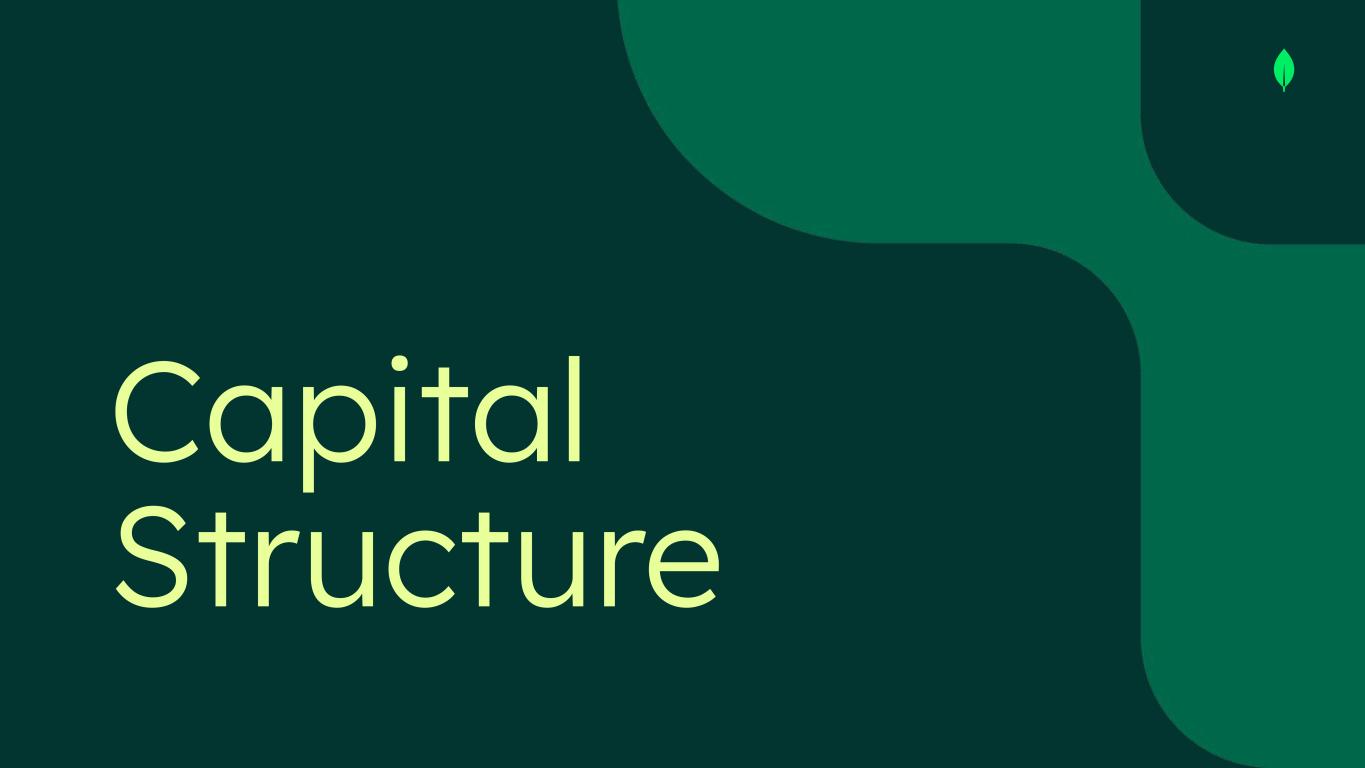 Non-GAAP Financial Measures This presentation includes the following financial measures defined as non-GAAP financial measures by the SEC: non-GAAP gross profit, non-GAAP income from operations, non-GAAP operating margin, cash conversion, free cash flow and free cash flow conversion. Non-GAAP gross profit excludes expenses associated with stock-based compensation. Non-GAAP income from operations and non-GAAP operating margin exclude expenses associated with stock-based compensation including employer payroll taxes upon the vesting and exercising of stock-based awards and expenses related to stock appreciation rights previously issued to our employees in China, amortization of intangible assets for the acquired technology and acquired customer relationships associated with prior acquisitions, certain acquisition-related costs and other, including due diligence costs, professional fees in connection with an acquisition and certain integration-related expenses, and restructuring costs associated with a formal restructuring plan that are primarily related to workforce reductions. The Company excludes these expenses because they are not reflective of ordinary course ongoing business and operating results. Free cash flow represents net cash from/used in operating activities, less capital expenditures, principal payments of finance lease liabilities and capitalized software development costs, if any. MongoDB uses free cash flow to understand and evaluate its liquidity and to generate future operating plans. The exclusion of capital expenditures, principal payments of finance lease liabilities and amounts capitalized for software development facilitates comparisons of MongoDB’s liquidity on a period-to-period basis and excludes items that it does not consider to be indicative of its liquidity. MongoDB believes that free cash flow is a measure of liquidity that provides useful information to investors in understanding and evaluating the strength of its liquidity and future ability to generate cash that can be used for strategic opportunities or investing in its business in the same manner as MongoDB’s management and board of directors. Cash conversion is defined as operating cash flow divided by non-GAAP income from operations. Free cash flow conversion is defined as free cash flow divided by non-GAAP income from operations. MongoDB uses these non-GAAP financial measures internally in analyzing its financial results and believes they are useful to investors, as a supplement to GAAP measures, in evaluating MongoDB’s ongoing operational performance. MongoDB believes that the use of these non-GAAP financial measures provides an additional tool for investors to use in evaluating ongoing operating results and trends and in comparing its financial results with other companies in MongoDB’s industry, many of which may present similar non-GAAP financial measures to investors. Non-GAAP financial measures have limitations as an analytical tool and should not be considered in isolation from, or as a substitute for, financial information prepared in accordance with GAAP. In particular, other companies may report non-GAAP gross profit, non-GAAP income from operations, non-GAAP operating margin and free cash flow or similarly titled measures but calculate them differently, which reduces their usefulness as comparative measures. Investors are encouraged to review the reconciliation of these non-GAAP financial measures to their most directly comparable GAAP financial measures, as presented below. Operating margin and free cash flow conversion are non-GAAP and reconciliations of non-GAAP operating margin and non-GAAP free cash flow conversion to the most directly comparable GAAP measures are not available without unreasonable efforts on a forward-looking basis due to the high variability, complexity and low visibility with respect to the charges excluded from these non-GAAP measures and the lack of a timeline for the achievement of said long-term financial model. This presentation and any future presentations containing such non-GAAP reconciliations can also be found on the Investor Relations page of MongoDB’s website at https://investors.mongodb.com.