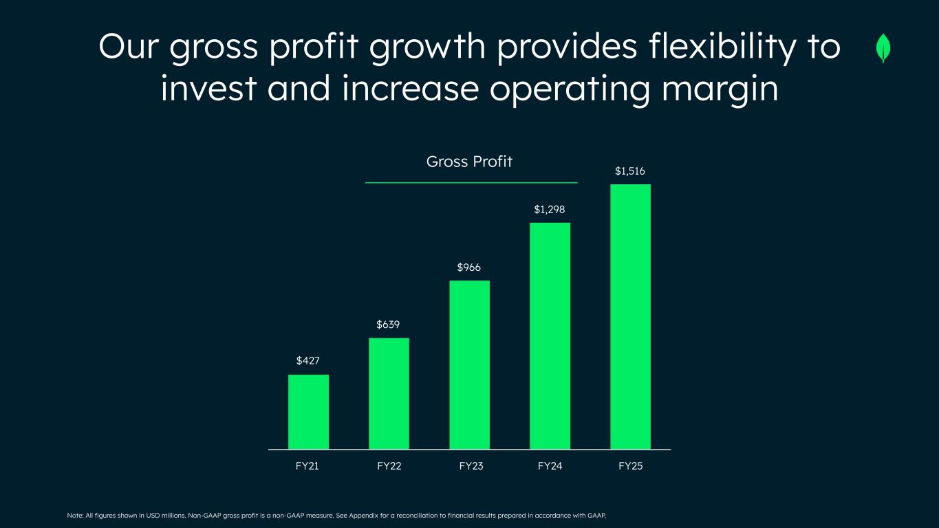 Note: All figures shown in USD millions. Non-GAAP gross profit is a non-GAAP measure. See Appendix for a reconciliation to financial results prepared in accordance with GAAP. Gross Profit FY21 FY22 FY23 FY24 FY25 $427 $639 $966 $1,298 $1,516 Our gross profit growth provides flexibility to invest and increase operating margin