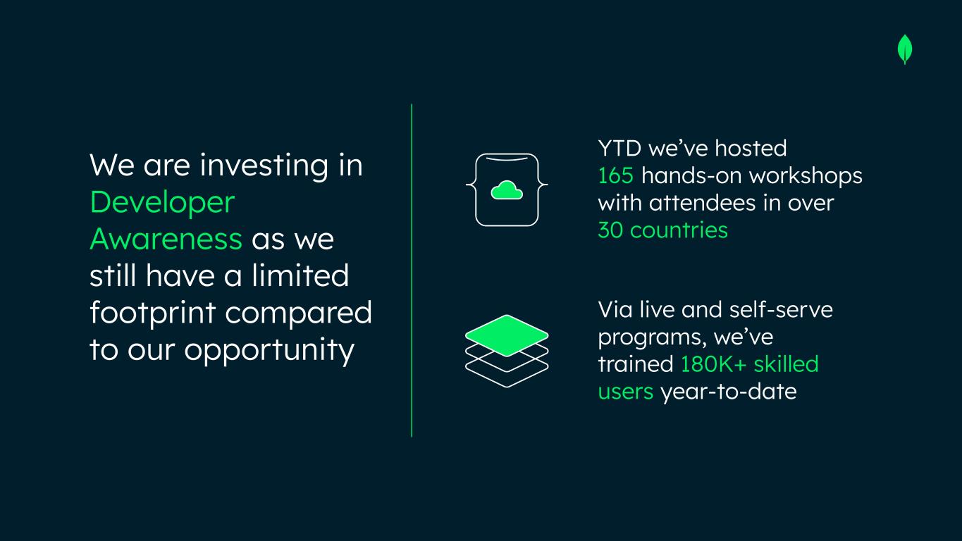 Via live and self-serve programs, we’ve trained 180K+ skilled users year-to-date YTD we’ve hosted 165 hands-on workshops with attendees in over 30 countries We are investing in Developer Awareness as we still have a limited footprint compared to our opportunity