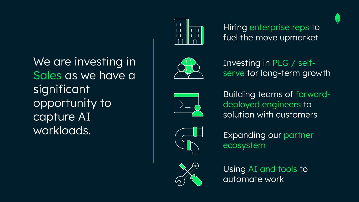 Expanding our partner ecosystem Hiring enterprise reps to fuel the move upmarket We are investing in Sales as we have a significant opportunity to capture AI workloads. Investing in PLG / self- serve for long-term growth Building teams of forward- deployed engineers to solution with customers Using AI and tools to automate work