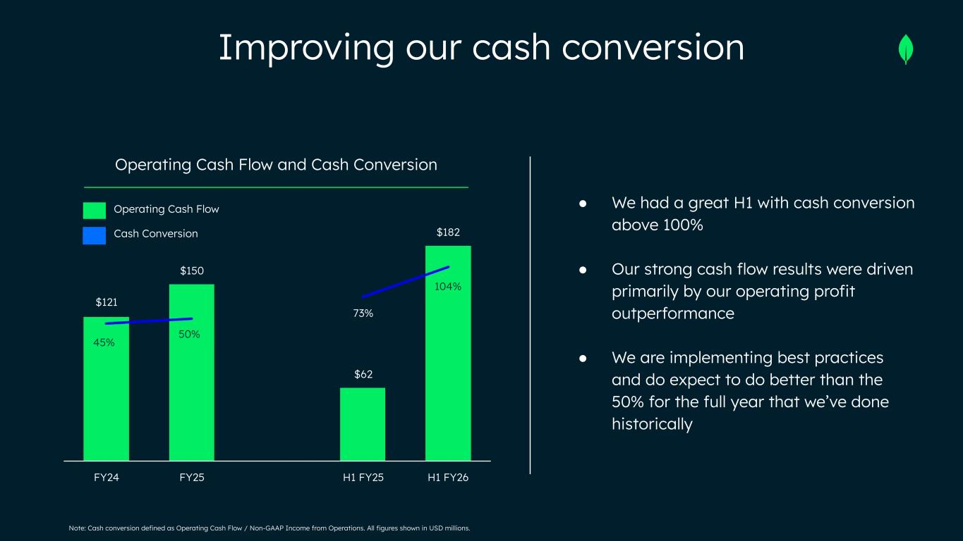 Operating Cash Flow and Cash Conversion ● We had a great H1 with cash conversion above 100% ● Our strong cash flow results were driven primarily by our operating profit outperformance ● We are implementing best practices and do expect to do better than the 50% for the full year that we’ve done historically Improving our cash conversion Operating Cash Flow Cash Conversion 45% 50% 104% $121 $150 $62 $182 73% FY24 FY25 H1 FY25 H1 FY26 Note: Cash conversion defined as Operating Cash Flow / Non-GAAP Income from Operations. All figures shown in USD millions.