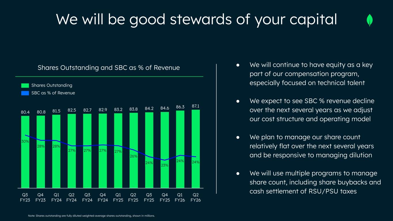 Shares Outstanding and SBC as % of Revenue Shares Outstanding SBC as % of Revenue ● We will continue to have equity as a key part of our compensation program, especially focused on technical talent ● We expect to see SBC % revenue decline over the next several years as we adjust our cost structure and operating model ● We plan to manage our share count relatively flat over the next several years and be responsive to managing dilution ● We will use multiple programs to manage share count, including share buybacks and cash settlement of RSU/PSU taxesQ3 FY23 Q4 FY23 Q1 FY24 Q2 FY24 Q3 FY24 Q4 FY24 Q1 FY25 Q2 FY25 Q3 FY25 Q4 FY25 Q1 FY26 Q2 FY26 24%24% 23%24% 26% 27%27%27%27% 28%28% 30% 80.4 80.8 81.5 82.5 82.7 82.9 83.2 83.8 84.2 84.6 86.3 87.1 Note: Shares outstanding are fully diluted weighted-average shares outstanding, shown in millions. We will be good stewards of your capital