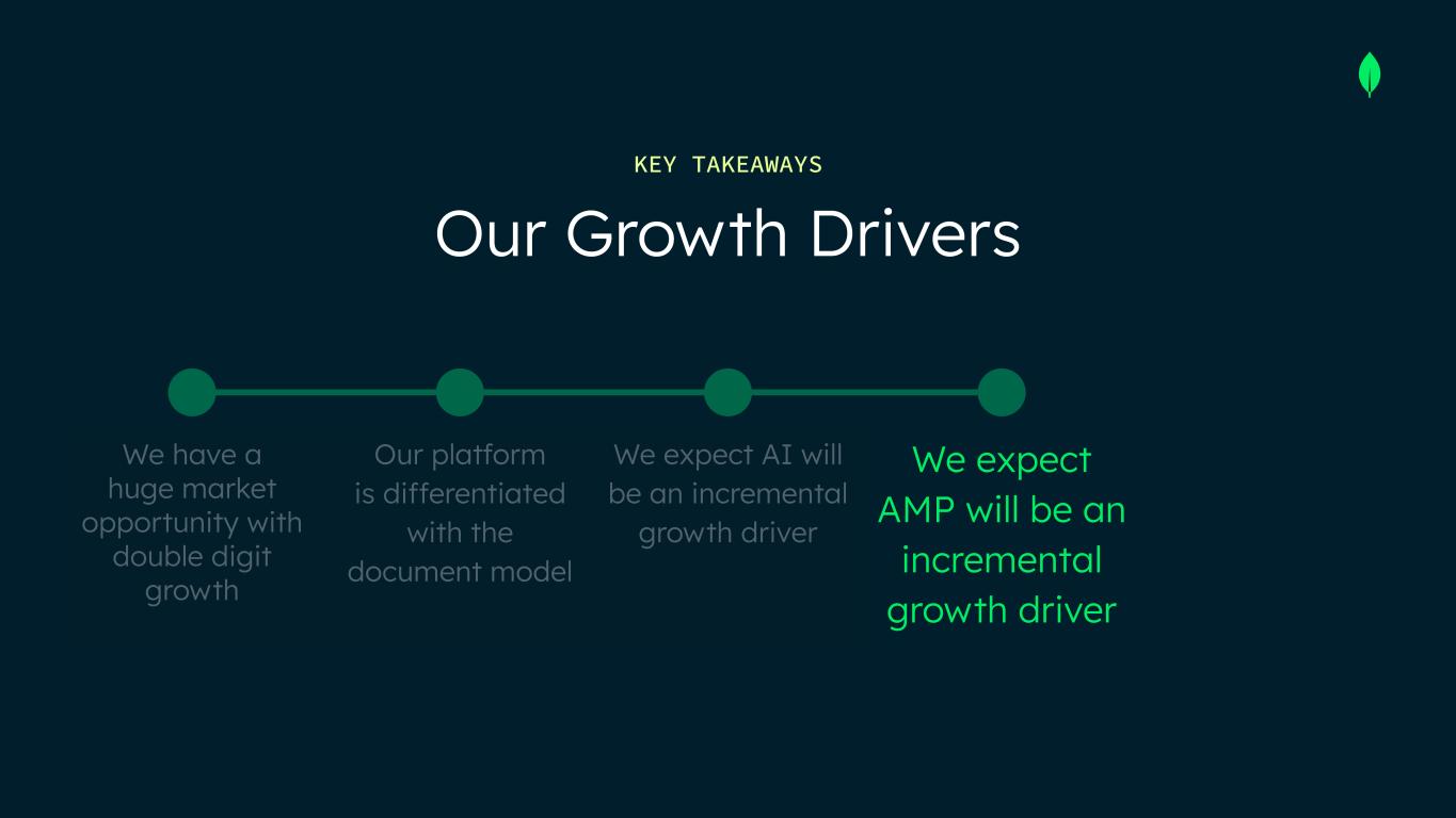 We have a huge market opportunity with double digit growth Our platform is differentiated with the document model We expect AI will be an incremental growth driver We expect AMP will be an incremental growth driver Our Growth Drivers KEY TAKEAWAYS