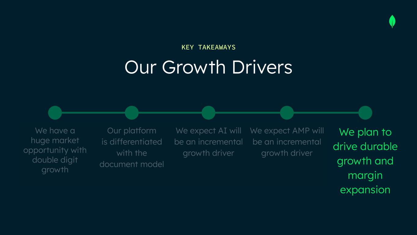 We plan to drive durable growth and margin expansion We have a huge market opportunity with double digit growth Our platform is differentiated with the document model We expect AI will be an incremental growth driver We expect AMP will be an incremental growth driver Our Growth Drivers KEY TAKEAWAYS