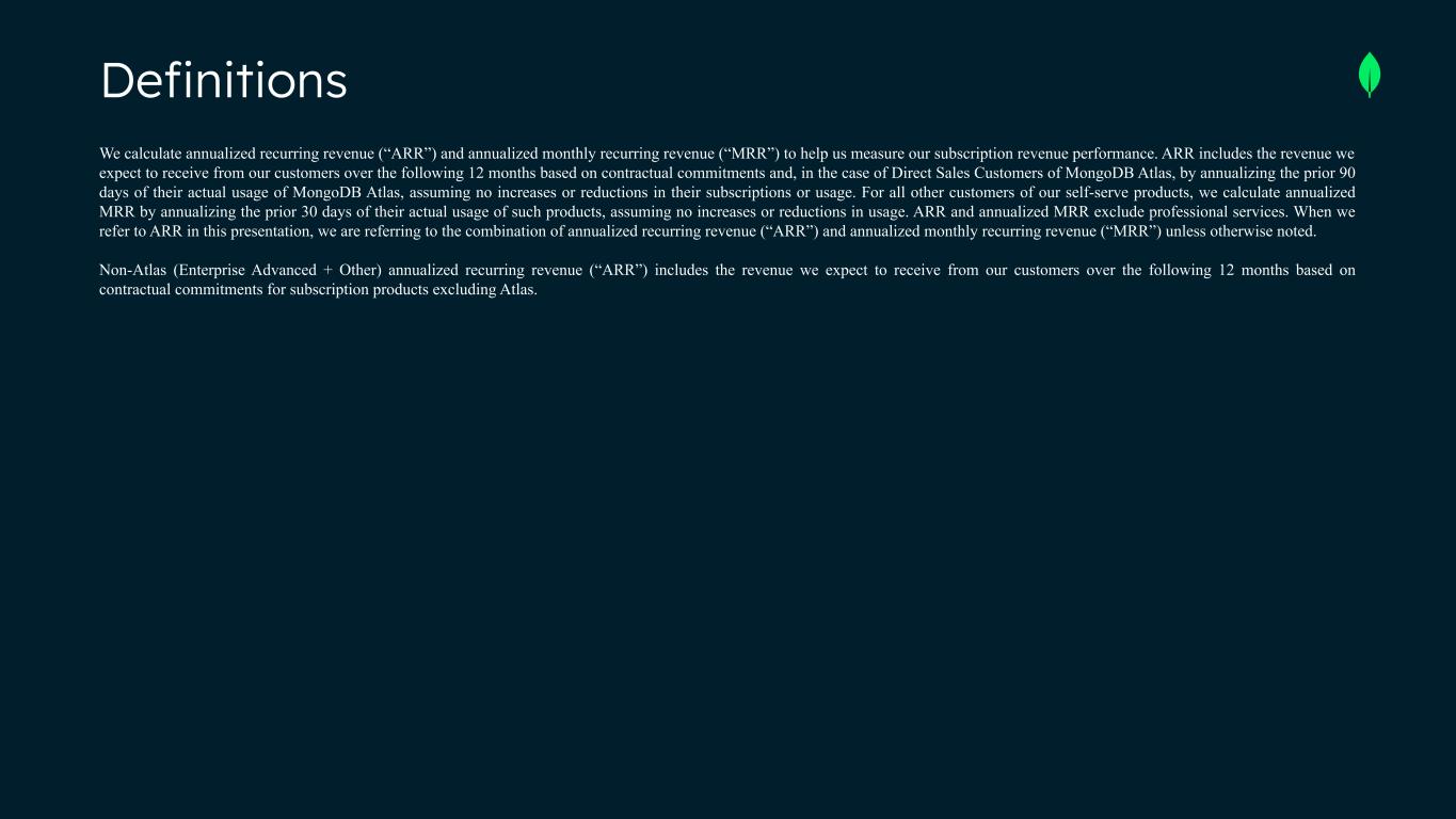 Definitions We calculate annualized recurring revenue (“ARR”) and annualized monthly recurring revenue (“MRR”) to help us measure our subscription revenue performance. ARR includes the revenue we expect to receive from our customers over the following 12 months based on contractual commitments and, in the case of Direct Sales Customers of MongoDB Atlas, by annualizing the prior 90 days of their actual usage of MongoDB Atlas, assuming no increases or reductions in their subscriptions or usage. For all other customers of our self-serve products, we calculate annualized MRR by annualizing the prior 30 days of their actual usage of such products, assuming no increases or reductions in usage. ARR and annualized MRR exclude professional services. When we refer to ARR in this presentation, we are referring to the combination of annualized recurring revenue (“ARR”) and annualized monthly recurring revenue (“MRR”) unless otherwise noted. Non-Atlas (Enterprise Advanced + Other) annualized recurring revenue (“ARR”) includes the revenue we expect to receive from our customers over the following 12 months based on contractual commitments for subscription products excluding Atlas.