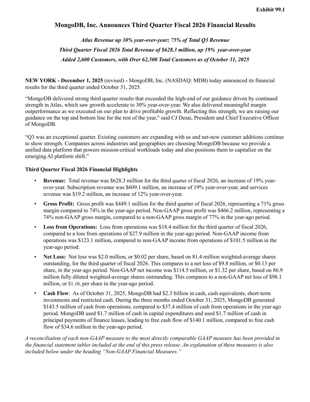 Exhibit 99.1 MongoDB, Inc. Announces Third Quarter Fiscal 2026 Financial Results Atlas Revenue up 30% year-over-year; 75% of Total Q3 Revenue Third Quarter Fiscal 2026 Total Revenue of $628.3 million, up 19% year-over-year Added 2,600 Customers, with Over 62,500 Total Customers as of October 31, 2025 NEW YORK - December 1, 2025 (revised) - MongoDB, Inc. (NASDAQ: MDB) today announced its financial results for the third quarter ended October 31, 2025. “MongoDB delivered strong third quarter results that exceeded the high-end of our guidance driven by continued strength in Atlas, which saw growth accelerate to 30% year-over-year. We also delivered meaningful margin outperformance as we executed on our plan to drive profitable growth. Reflecting this strength, we are raising our guidance on the top and bottom line for the rest of the year," said CJ Desai, President and Chief Executive Officer of MongoDB. “Q3 was an exceptional quarter. Existing customers are expanding with us and net-new customer additions continue to show strength. Companies across industries and geographies are choosing MongoDB because we provide a unified data platform that powers mission-critical workloads today and also positions them to capitalize on the emerging AI platform shift.” Third Quarter Fiscal 2026 Financial Highlights • Revenue: Total revenue was $628.3 million for the third quarter of fiscal 2026, an increase of 19% year- over-year. Subscription revenue was $609.1 million, an increase of 19% year-over-year, and services revenue was $19.2 million, an increase of 12% year-over-year. • Gross Profit: Gross profit was $449.1 million for the third quarter of fiscal 2026, representing a 71% gross margin compared to 74% in the year-ago period. Non-GAAP gross profit was $466.2 million, representing a 74% non-GAAP gross margin, compared to a non-GAAP gross margin of 77% in the year-ago period. • Loss from Operations: Loss from operations was $18.4 million for the third quarter of fiscal 2026, compared to a loss from operations of $27.9 million in the year-ago period. Non-GAAP income from operations was $123.1 million, compared to non-GAAP income from operations of $101.5 million in the year-ago period. • Net Loss: Net loss was $2.0 million, or $0.02 per share, based on 81.4 million weighted-average shares outstanding, for the third quarter of fiscal 2026. This compares to a net loss of $9.8 million, or $0.13 per share, in the year-ago period. Non-GAAP net income was $114.5 million, or $1.32 per share, based on 86.9 million fully diluted weighted-average shares outstanding. This compares to a non-GAAP net loss of $98.1 million, or $1.16, per share in the year-ago period. • Cash Flow: As of October 31, 2025, MongoDB had $2.3 billion in cash, cash equivalents, short-term investments and restricted cash. During the three months ended October 31, 2025, MongoDB generated $143.5 million of cash from operations, compared to $37.4 million of cash from operations in the year-ago period. MongoDB used $1.7 million of cash in capital expenditures and used $1.7 million of cash in principal payments of finance leases, leading to free cash flow of $140.1 million, compared to free cash flow of $34.6 million in the year-ago period. A reconciliation of each non-GAAP measure to the most directly comparable GAAP measure has been provided in the financial statement tables included at the end of this press release. An explanation of these measures is also included below under the heading “Non-GAAP Financial Measures.”