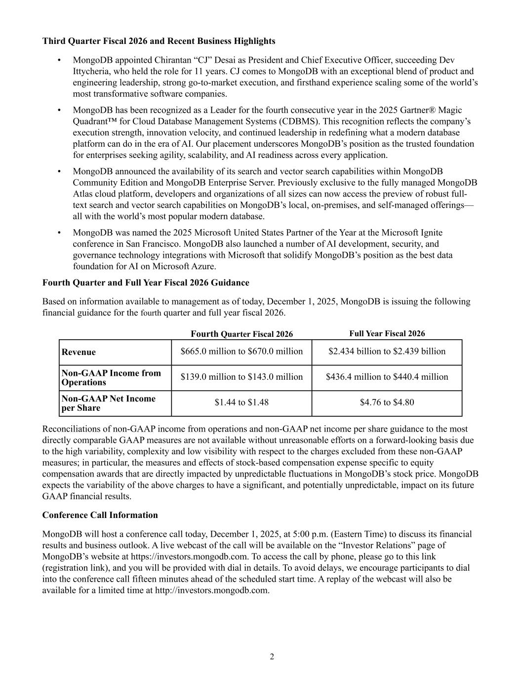 2 Third Quarter Fiscal 2026 and Recent Business Highlights • MongoDB appointed Chirantan “CJ” Desai as President and Chief Executive Officer, succeeding Dev Ittycheria, who held the role for 11 years. CJ comes to MongoDB with an exceptional blend of product and engineering leadership, strong go-to-market execution, and firsthand experience scaling some of the world’s most transformative software companies. • MongoDB has been recognized as a Leader for the fourth consecutive year in the 2025 Gartner® Magic Quadrant™ for Cloud Database Management Systems (CDBMS). This recognition reflects the company’s execution strength, innovation velocity, and continued leadership in redefining what a modern database platform can do in the era of AI. Our placement underscores MongoDB’s position as the trusted foundation for enterprises seeking agility, scalability, and AI readiness across every application. • MongoDB announced the availability of its search and vector search capabilities within MongoDB Community Edition and MongoDB Enterprise Server. Previously exclusive to the fully managed MongoDB Atlas cloud platform, developers and organizations of all sizes can now access the preview of robust full- text search and vector search capabilities on MongoDB’s local, on-premises, and self-managed offerings— all with the world’s most popular modern database. • MongoDB was named the 2025 Microsoft United States Partner of the Year at the Microsoft Ignite conference in San Francisco. MongoDB also launched a number of AI development, security, and governance technology integrations with Microsoft that solidify MongoDB’s position as the best data foundation for AI on Microsoft Azure. Fourth Quarter and Full Year Fiscal 2026 Guidance Based on information available to management as of today, December 1, 2025, MongoDB is issuing the following financial guidance for the fourth quarter and full year fiscal 2026. Fourth Quarter Fiscal 2026 Full Year Fiscal 2026 Revenue $665.0 million to $670.0 million $2.434 billion to $2.439 billion Non-GAAP Income from Operations $139.0 million to $143.0 million $436.4 million to $440.4 million Non-GAAP Net Income per Share $1.44 to $1.48 $4.76 to $4.80 Reconciliations of non-GAAP income from operations and non-GAAP net income per share guidance to the most directly comparable GAAP measures are not available without unreasonable efforts on a forward-looking basis due to the high variability, complexity and low visibility with respect to the charges excluded from these non-GAAP measures; in particular, the measures and effects of stock-based compensation expense specific to equity compensation awards that are directly impacted by unpredictable fluctuations in MongoDB’s stock price. MongoDB expects the variability of the above charges to have a significant, and potentially unpredictable, impact on its future GAAP financial results. Conference Call Information MongoDB will host a conference call today, December 1, 2025, at 5:00 p.m. (Eastern Time) to discuss its financial results and business outlook. A live webcast of the call will be available on the “Investor Relations” page of MongoDB’s website at https://investors.mongodb.com. To access the call by phone, please go to this link (registration link), and you will be provided with dial in details. To avoid delays, we encourage participants to dial into the conference call fifteen minutes ahead of the scheduled start time. A replay of the webcast will also be available for a limited time at http://investors.mongodb.com.
