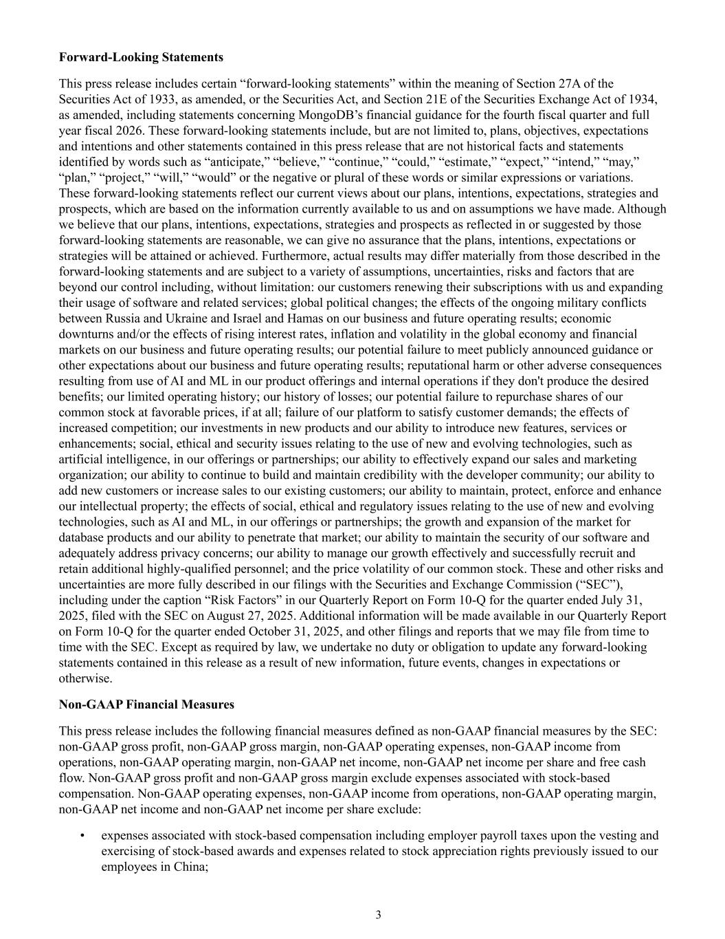 3 Forward-Looking Statements This press release includes certain “forward-looking statements” within the meaning of Section 27A of the Securities Act of 1933, as amended, or the Securities Act, and Section 21E of the Securities Exchange Act of 1934, as amended, including statements concerning MongoDB’s financial guidance for the fourth fiscal quarter and full year fiscal 2026. These forward-looking statements include, but are not limited to, plans, objectives, expectations and intentions and other statements contained in this press release that are not historical facts and statements identified by words such as “anticipate,” “believe,” “continue,” “could,” “estimate,” “expect,” “intend,” “may,” “plan,” “project,” “will,” “would” or the negative or plural of these words or similar expressions or variations. These forward-looking statements reflect our current views about our plans, intentions, expectations, strategies and prospects, which are based on the information currently available to us and on assumptions we have made. Although we believe that our plans, intentions, expectations, strategies and prospects as reflected in or suggested by those forward-looking statements are reasonable, we can give no assurance that the plans, intentions, expectations or strategies will be attained or achieved. Furthermore, actual results may differ materially from those described in the forward-looking statements and are subject to a variety of assumptions, uncertainties, risks and factors that are beyond our control including, without limitation: our customers renewing their subscriptions with us and expanding their usage of software and related services; global political changes; the effects of the ongoing military conflicts between Russia and Ukraine and Israel and Hamas on our business and future operating results; economic downturns and/or the effects of rising interest rates, inflation and volatility in the global economy and financial markets on our business and future operating results; our potential failure to meet publicly announced guidance or other expectations about our business and future operating results; reputational harm or other adverse consequences resulting from use of AI and ML in our product offerings and internal operations if they don't produce the desired benefits; our limited operating history; our history of losses; our potential failure to repurchase shares of our common stock at favorable prices, if at all; failure of our platform to satisfy customer demands; the effects of increased competition; our investments in new products and our ability to introduce new features, services or enhancements; social, ethical and security issues relating to the use of new and evolving technologies, such as artificial intelligence, in our offerings or partnerships; our ability to effectively expand our sales and marketing organization; our ability to continue to build and maintain credibility with the developer community; our ability to add new customers or increase sales to our existing customers; our ability to maintain, protect, enforce and enhance our intellectual property; the effects of social, ethical and regulatory issues relating to the use of new and evolving technologies, such as AI and ML, in our offerings or partnerships; the growth and expansion of the market for database products and our ability to penetrate that market; our ability to maintain the security of our software and adequately address privacy concerns; our ability to manage our growth effectively and successfully recruit and retain additional highly-qualified personnel; and the price volatility of our common stock. These and other risks and uncertainties are more fully described in our filings with the Securities and Exchange Commission (“SEC”), including under the caption “Risk Factors” in our Quarterly Report on Form 10-Q for the quarter ended July 31, 2025, filed with the SEC on August 27, 2025. Additional information will be made available in our Quarterly Report on Form 10-Q for the quarter ended October 31, 2025, and other filings and reports that we may file from time to time with the SEC. Except as required by law, we undertake no duty or obligation to update any forward-looking statements contained in this release as a result of new information, future events, changes in expectations or otherwise. Non-GAAP Financial Measures This press release includes the following financial measures defined as non-GAAP financial measures by the SEC: non-GAAP gross profit, non-GAAP gross margin, non-GAAP operating expenses, non-GAAP income from operations, non-GAAP operating margin, non-GAAP net income, non-GAAP net income per share and free cash flow. Non-GAAP gross profit and non-GAAP gross margin exclude expenses associated with stock-based compensation. Non-GAAP operating expenses, non-GAAP income from operations, non-GAAP operating margin, non-GAAP net income and non-GAAP net income per share exclude: • expenses associated with stock-based compensation including employer payroll taxes upon the vesting and exercising of stock-based awards and expenses related to stock appreciation rights previously issued to our employees in China;